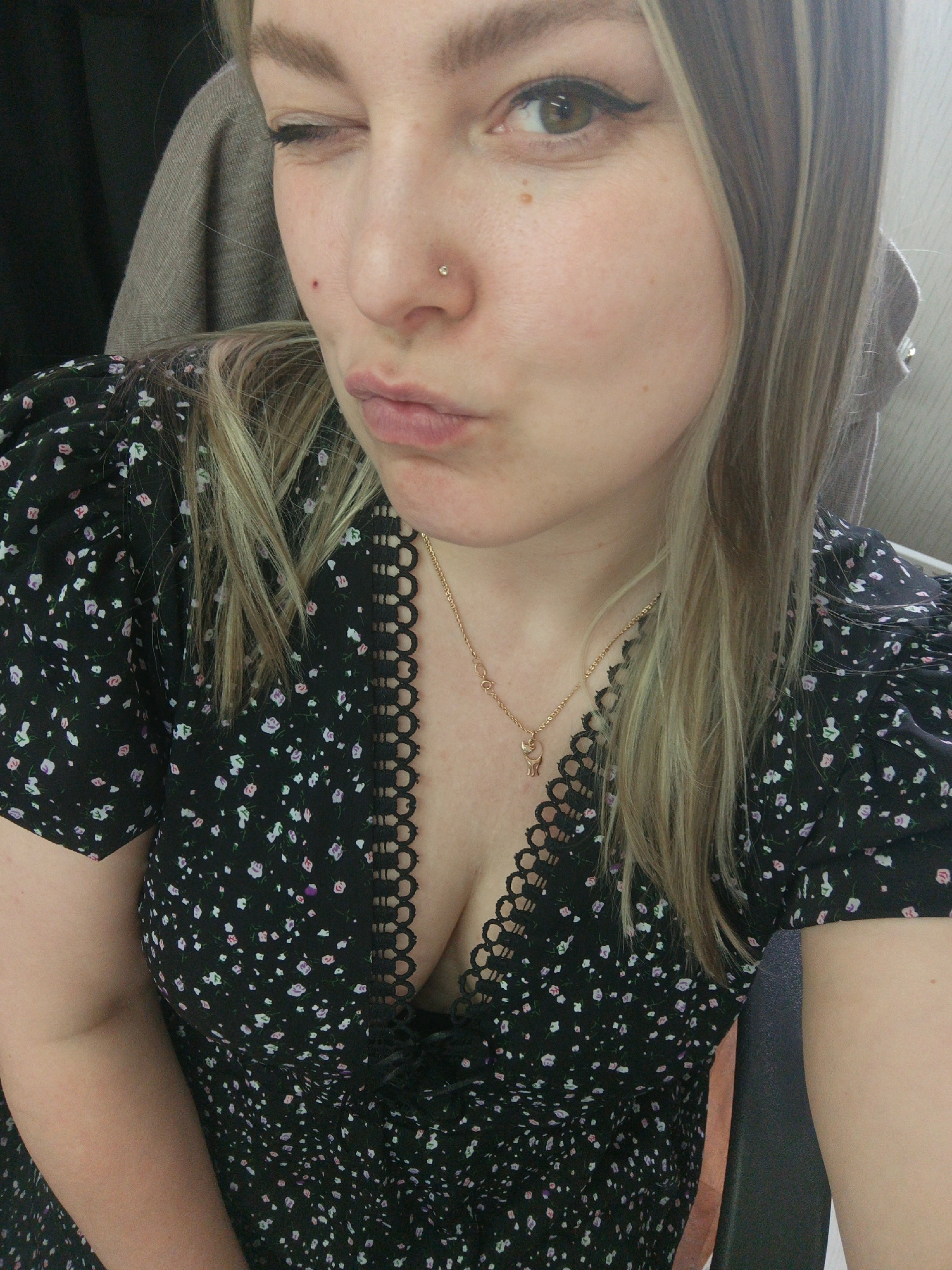 A woman is facing the camera and winking. She has fair skin and blonde hair with darker streaks. She has a nose piercing and is wearing a black floral dress with a decorative scalloped neckline and a…read more
