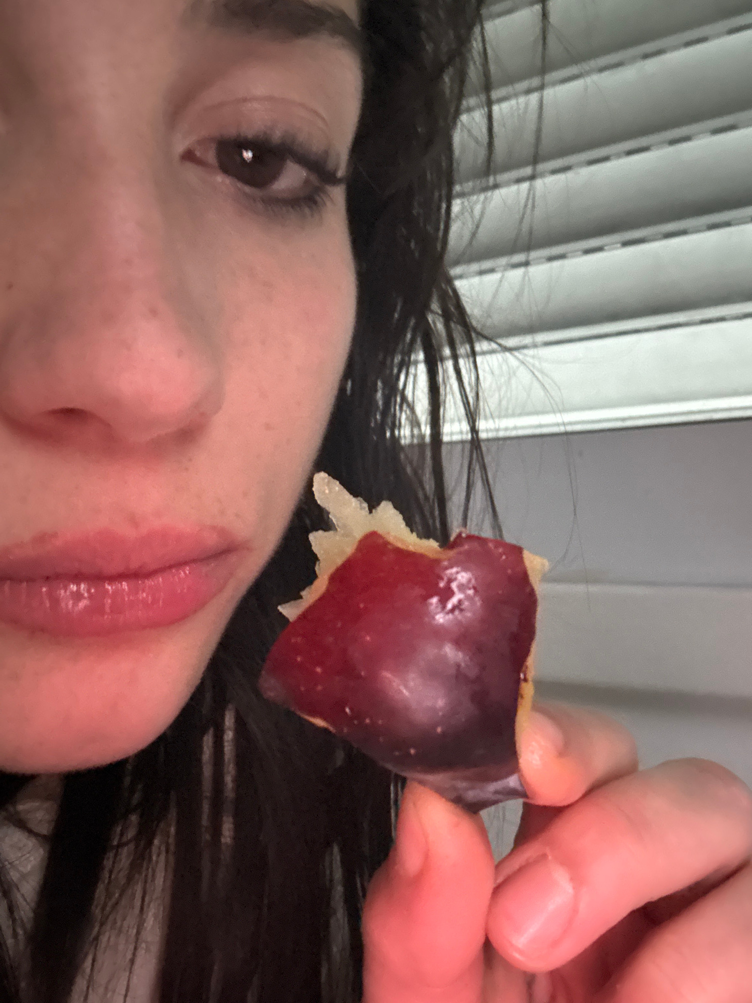 A close-up, slightly angled shot of a person holding a partially eaten fruit in their hand. The person's face is visible, featuring dark hair, an eye, a nose, and lips. The skin tone is light. The fru…read more