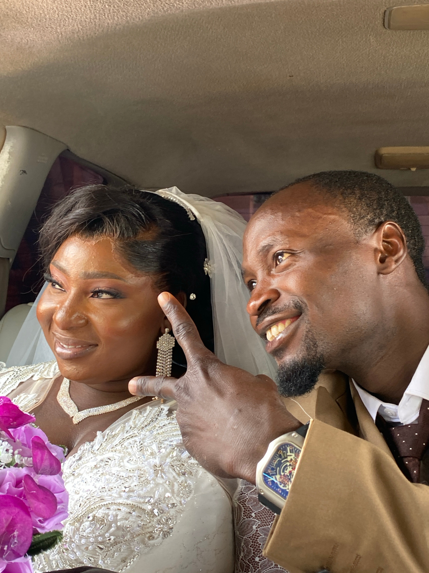 A dark-skinned man and woman, presumably a newly married couple, are indoors. The location, Kuru Karama, Nigeria, cannot be confirmed from the image. The man, wearing a brown suit and tie, smiles as he touches the woman’s face. She is wearing a white wedding dress, veil, and jewelry, and holds a purple flower bouquet. The setting appears to be inside a vehicle, based on the upholstered interior. | Open Wire