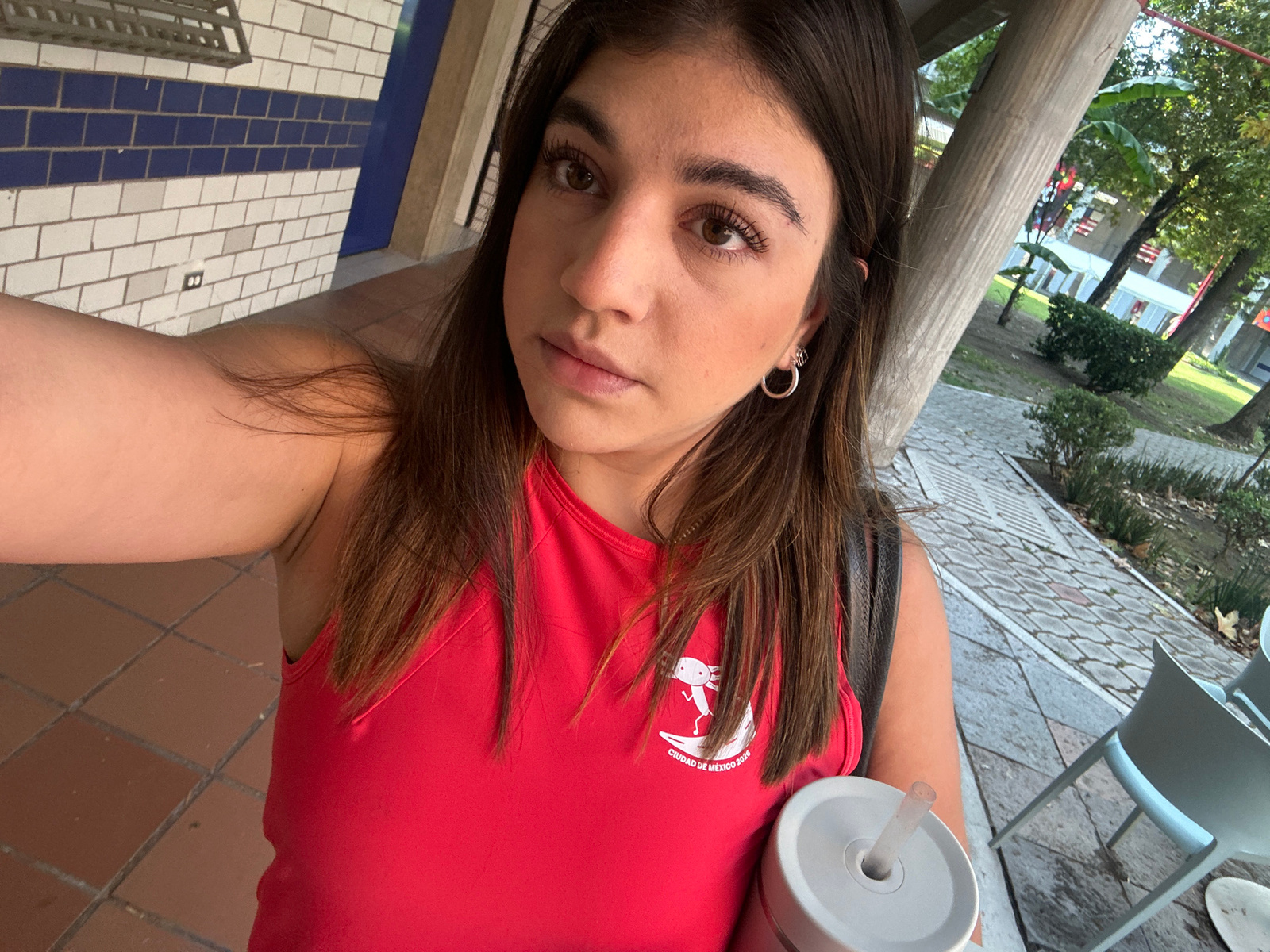 A person is shown in a close-up, angled selfie. The subject has brown hair, light skin, and brown eyes. They wear a red top with a white logo depicting an axolotl and the words "CIUDAD DE MEXICO 2026"…read more