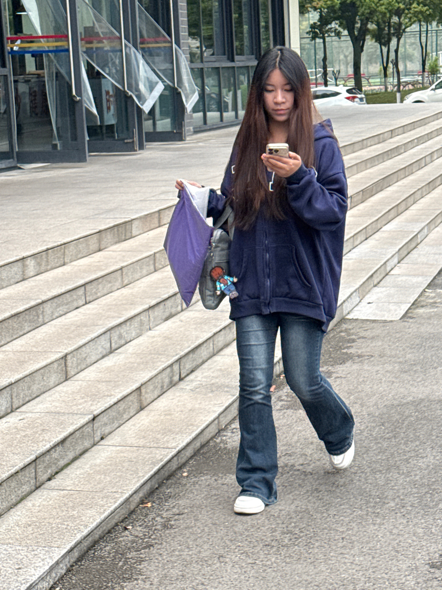 A young woman is seen on a stepped concrete area in what could be Jiangjin, China. She is holding a smartphone, possibly interacting with it. The woman is wearing jeans, a dark blue zip-up hoodie, and…read more