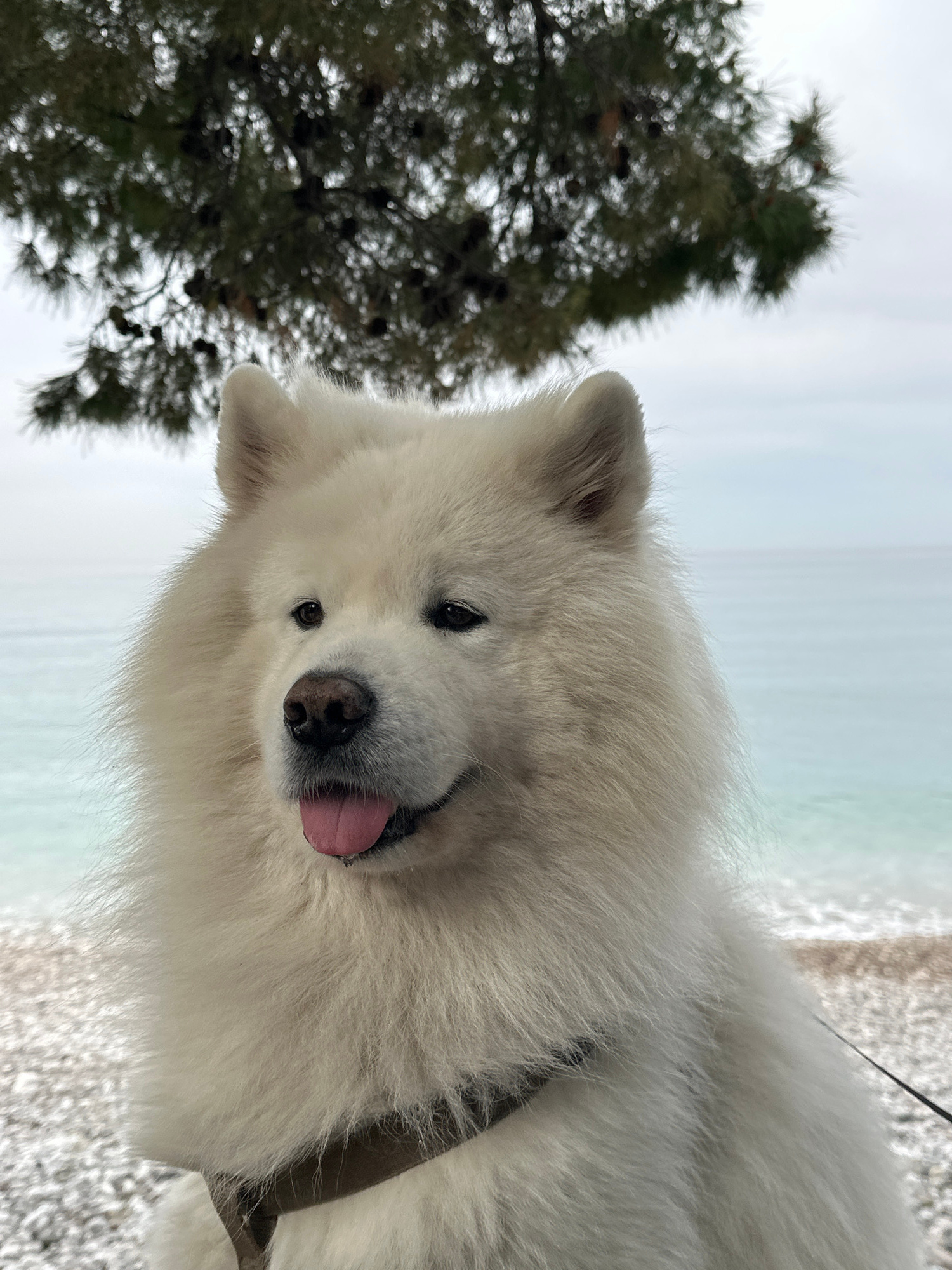 A medium shot photograph depicts a white Samoyed dog with its tongue slightly out, positioned in front of a coniferous tree. The dog appears to be wearing a collar or harness. The background shows a b…read more