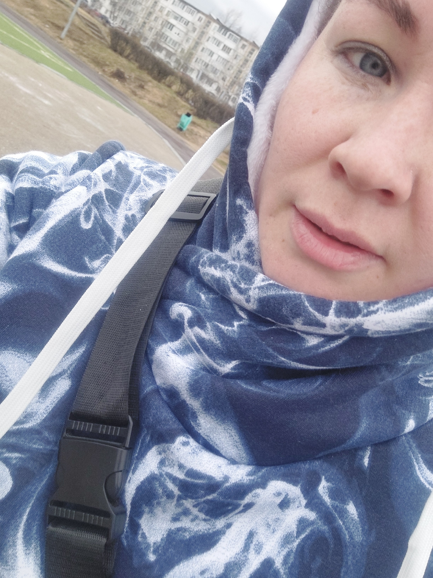 The image is a selfie of a person wearing a blue and white tie-dye hoodie with white drawstrings and a black strap with a black buckle across the chest. The person has fair skin, light-colored eyes, a…read more