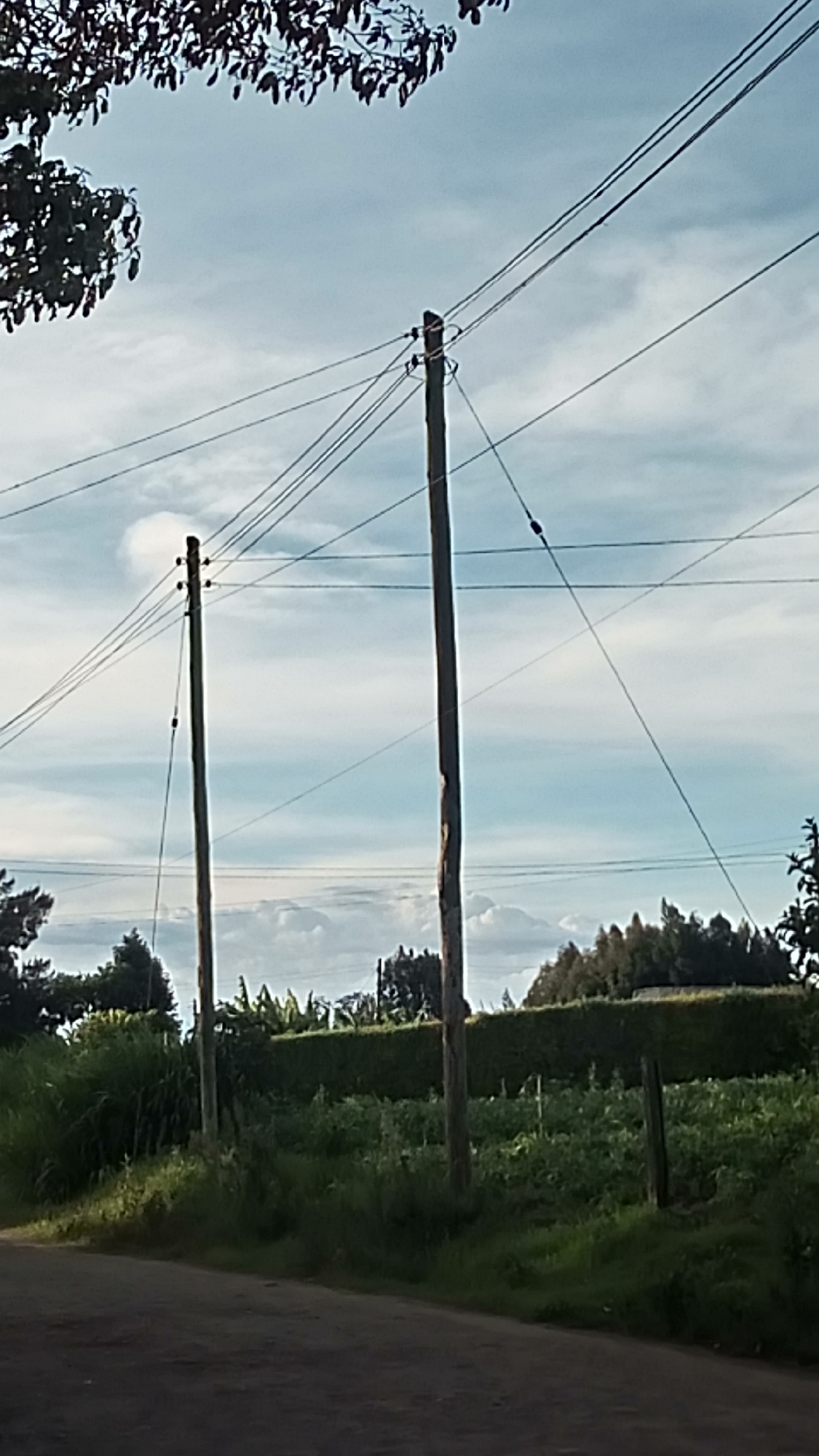 The image depicts a rural roadside scene in Ndeiya, Kenya. Two wooden utility poles stand parallel to the road, supporting multiple electrical wires against a backdrop of a partly cloudy sky. Vegetati…read more
