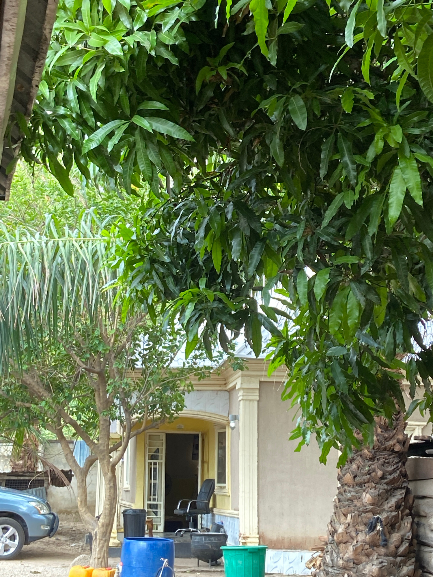 The image shows a building in Mararaba, Nigeria, partially obscured by lush green trees and foliage. The building has a yellow facade with white columns and a doorway visible through the trees. An off…read more
