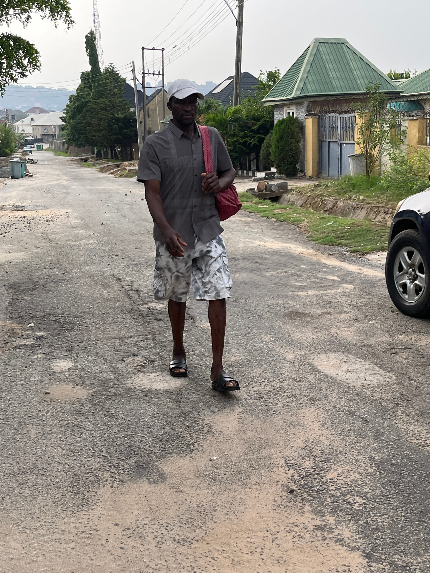 An elderly man is standing on an asphalt road in what appears to be a residential area of Abuja, Nigeria. He is wearing a gray short-sleeved shirt, patterned gray and white shorts, and sandals. He has…read more
