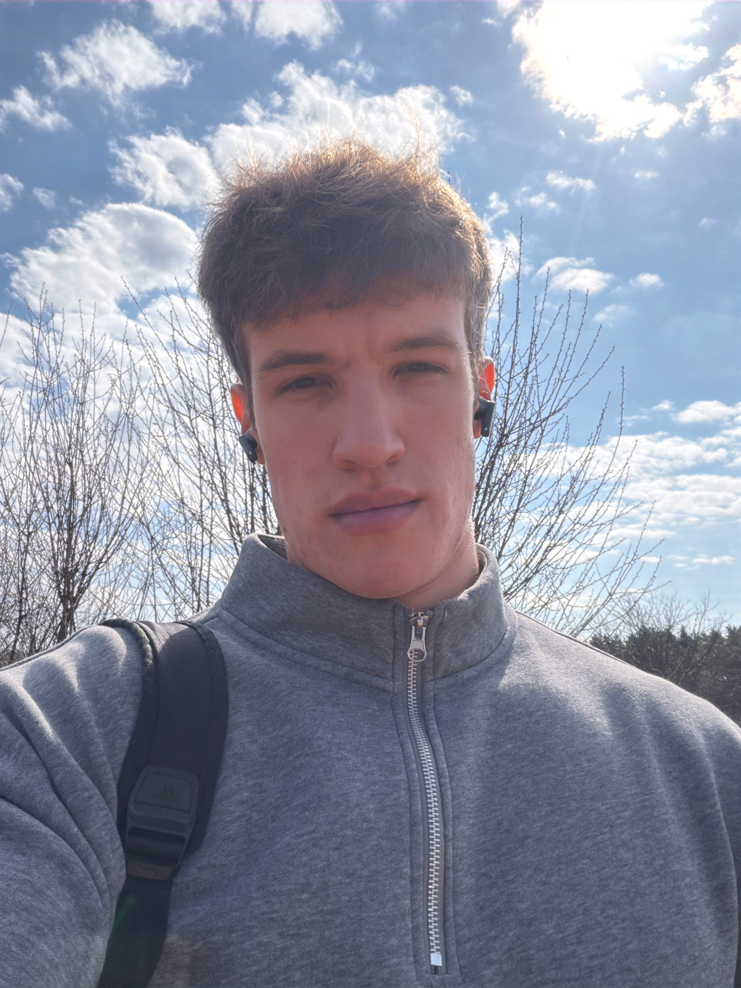 A young man is featured in a close-up, low-angle selfie, looking directly at the camera with a neutral expression. He has short, light brown hair. He is wearing a grey zippered jacket, and a black bac…read more