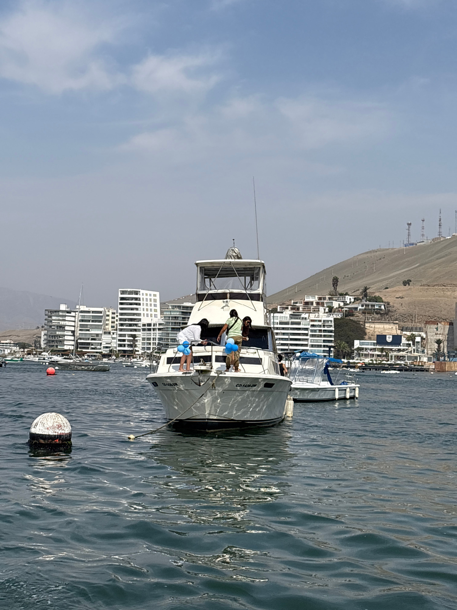 A daytime shot in Ancón, Peru, showcases a medium-sized white yacht with at least two individuals on its deck, positioned in a body of water. The individuals appear to be interacting or observing the…read more