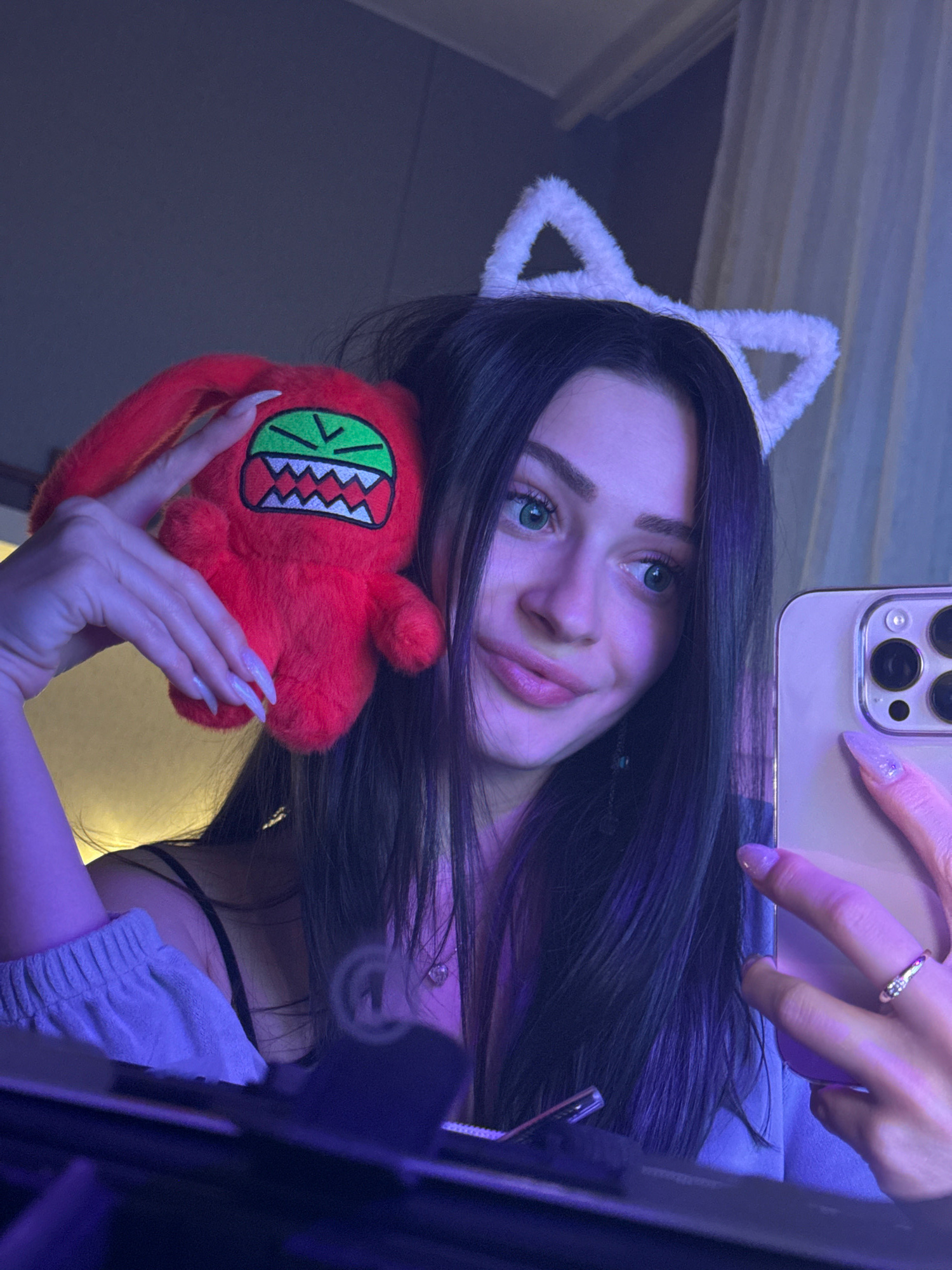 A woman takes a selfie with her phone. She has long, dark hair and is wearing white cat ears. She is holding a red, plush toy monster. She has long, pointed fingernails and a ring on her finger. The p…read more