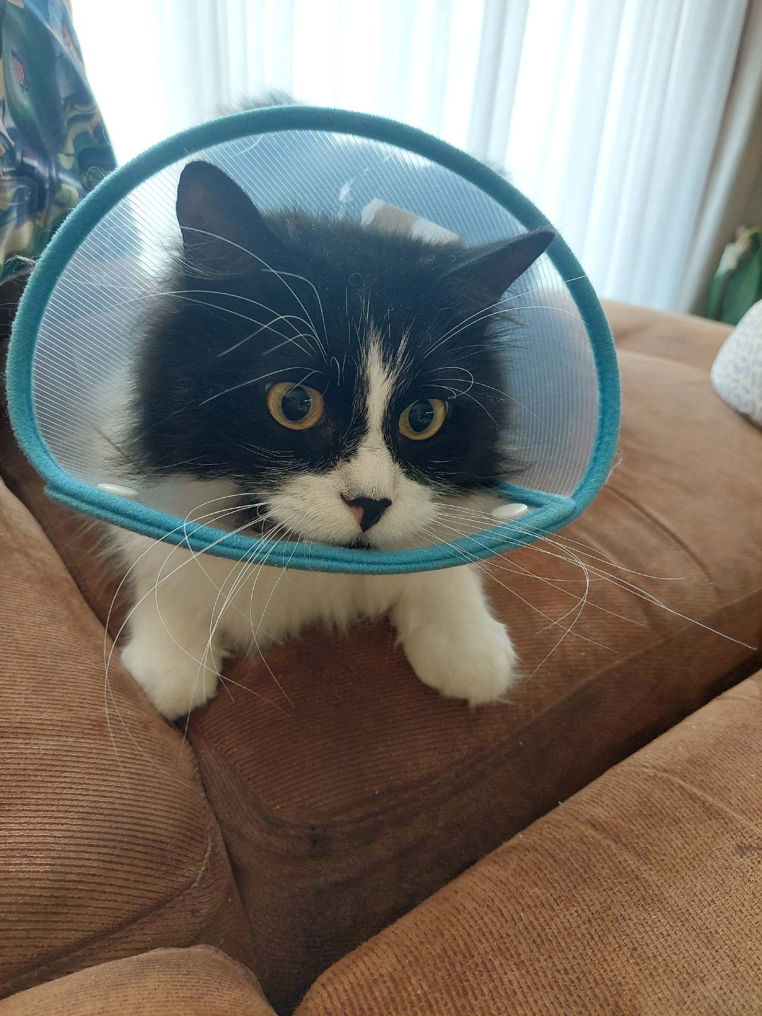 A medium shot depicts a black and white cat wearing a blue plastic cone resting on a brown corduroy sofa. The cat is positioned facing the camera, with its head tilted slightly to the side. The cat's…read more
