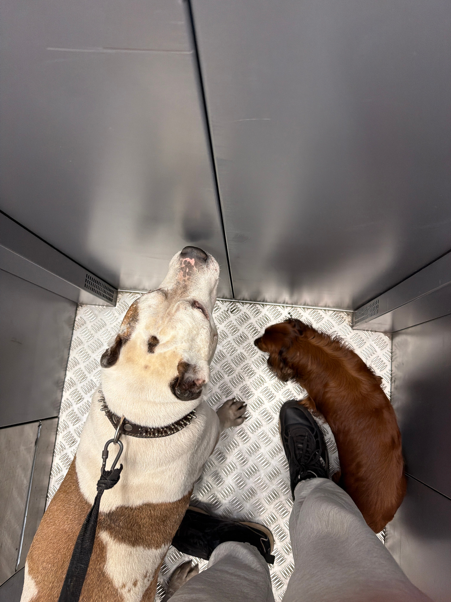 The image shows a first-person perspective looking down inside what appears to be an elevator. Two dogs and two feet wearing shoes are visible. One dog is a medium-sized breed with brown fur, curled u…read more