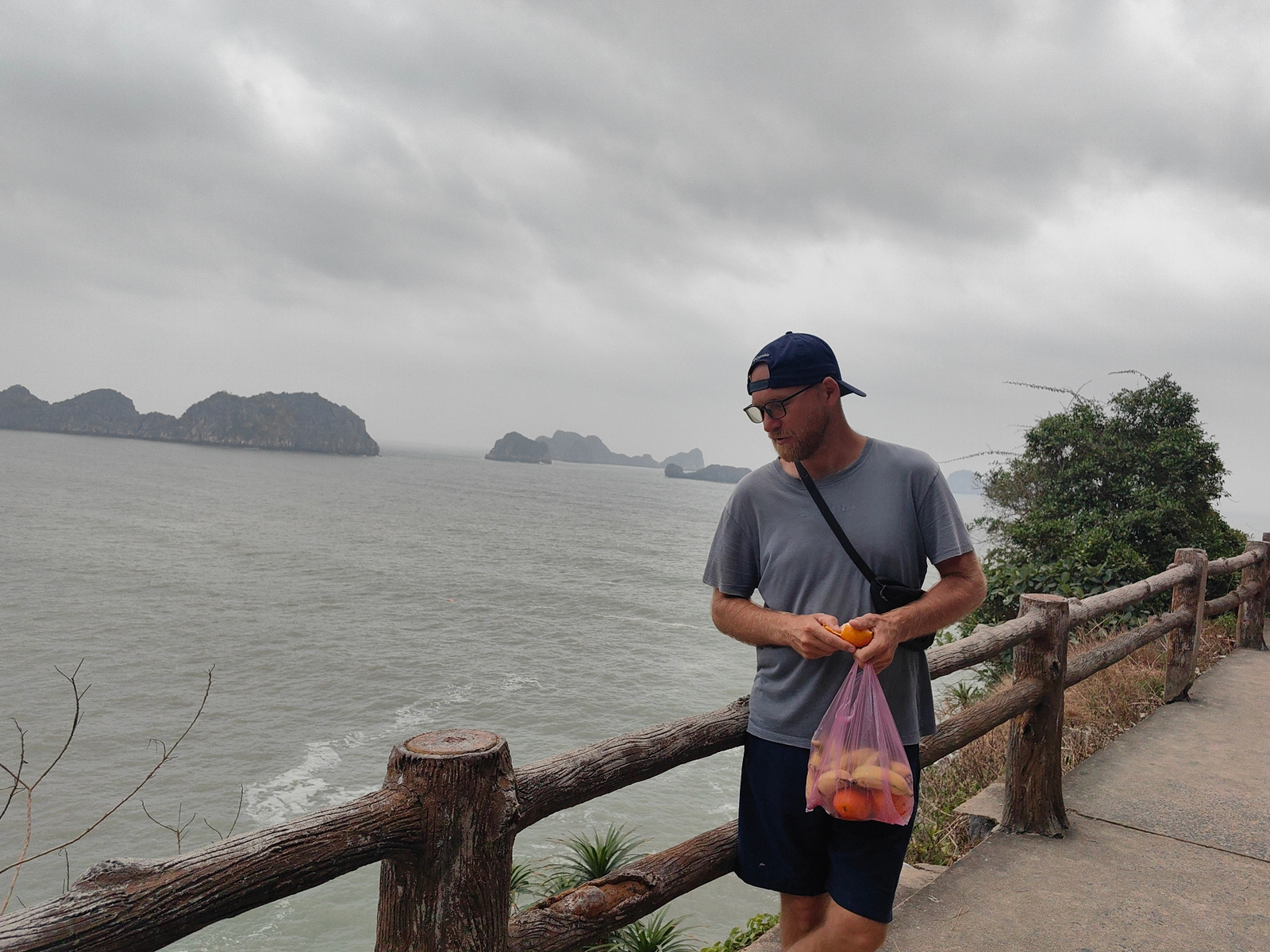 A man in a gray t-shirt, dark blue shorts, a dark blue baseball cap, and glasses stands next to a wooden railing holding a plastic bag of fruit. He is peeling an orange. A shoulder bag strap is visibl…read more