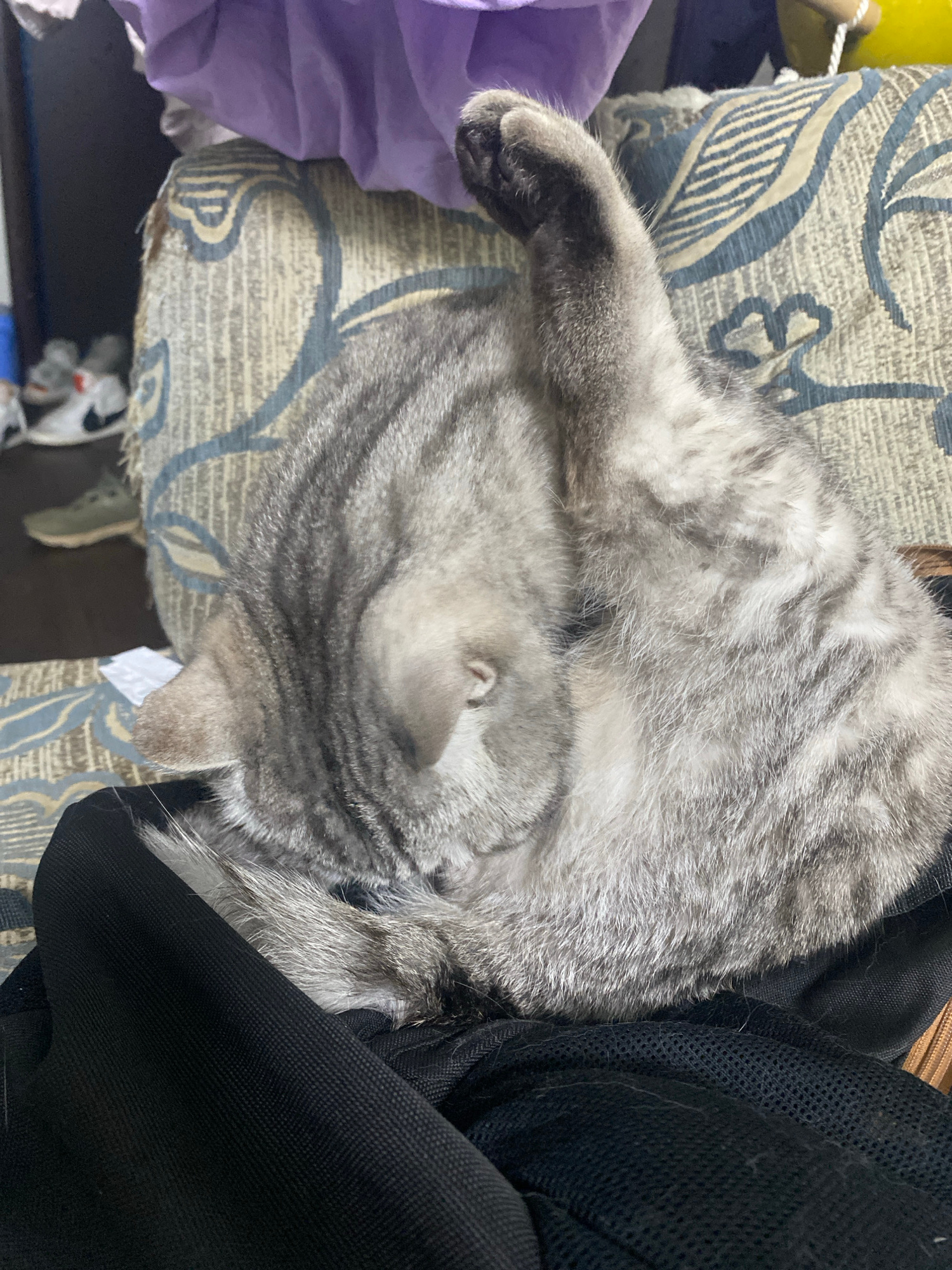 A silver tabby cat is captured in a close-up, overhead view, curled up and seemingly asleep indoors. The cat's distinctive grey fur with darker stripes covers most of the frame. Its head is tucked und…read more