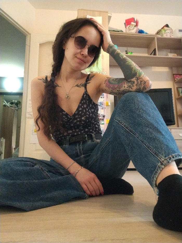 A woman sits cross-legged on the floor wearing a black floral print top, blue jeans, and black socks. She has long dark hair braided to the side, sunglasses, and a tattoo sleeve on her left arm. She r…read more