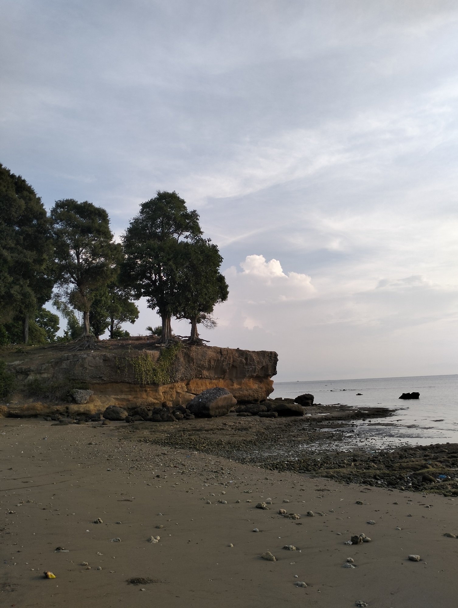 The image depicts a coastal landscape in Lhokmanee, Indonesia. A small cliff, topped with trees, overlooks a beach with a mix of sand, pebbles, and rocks. The sky is overcast, with some light clouds.…read more