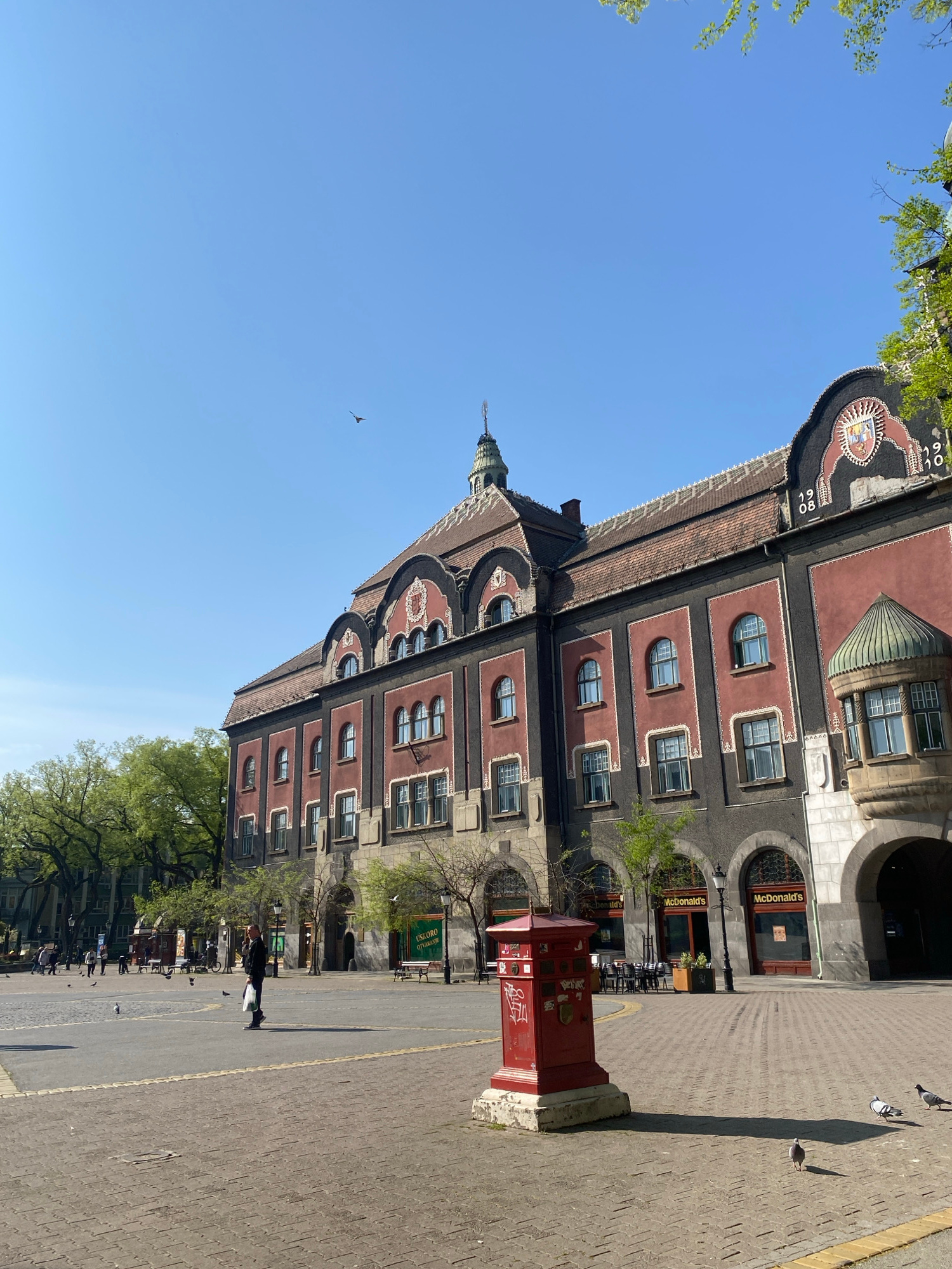 This image captures a vibrant street scene in Subotica, Serbia, on a clear, sunny day. The dominant feature is a large, ornate building occupying the right side of the frame. Its architecture suggests…read more
