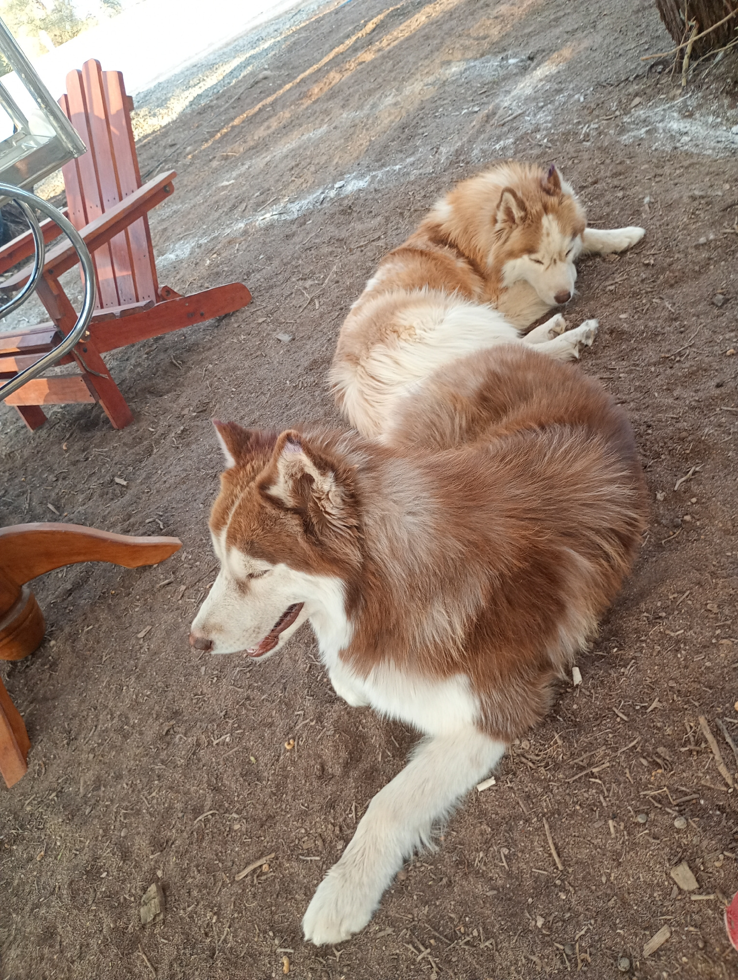 Two Siberian Huskies are lying on the ground. The husky closest to the viewer is looking to the left of the frame, and the other is sleeping. They are both light brown and white. The ground is dirt. I…read more
