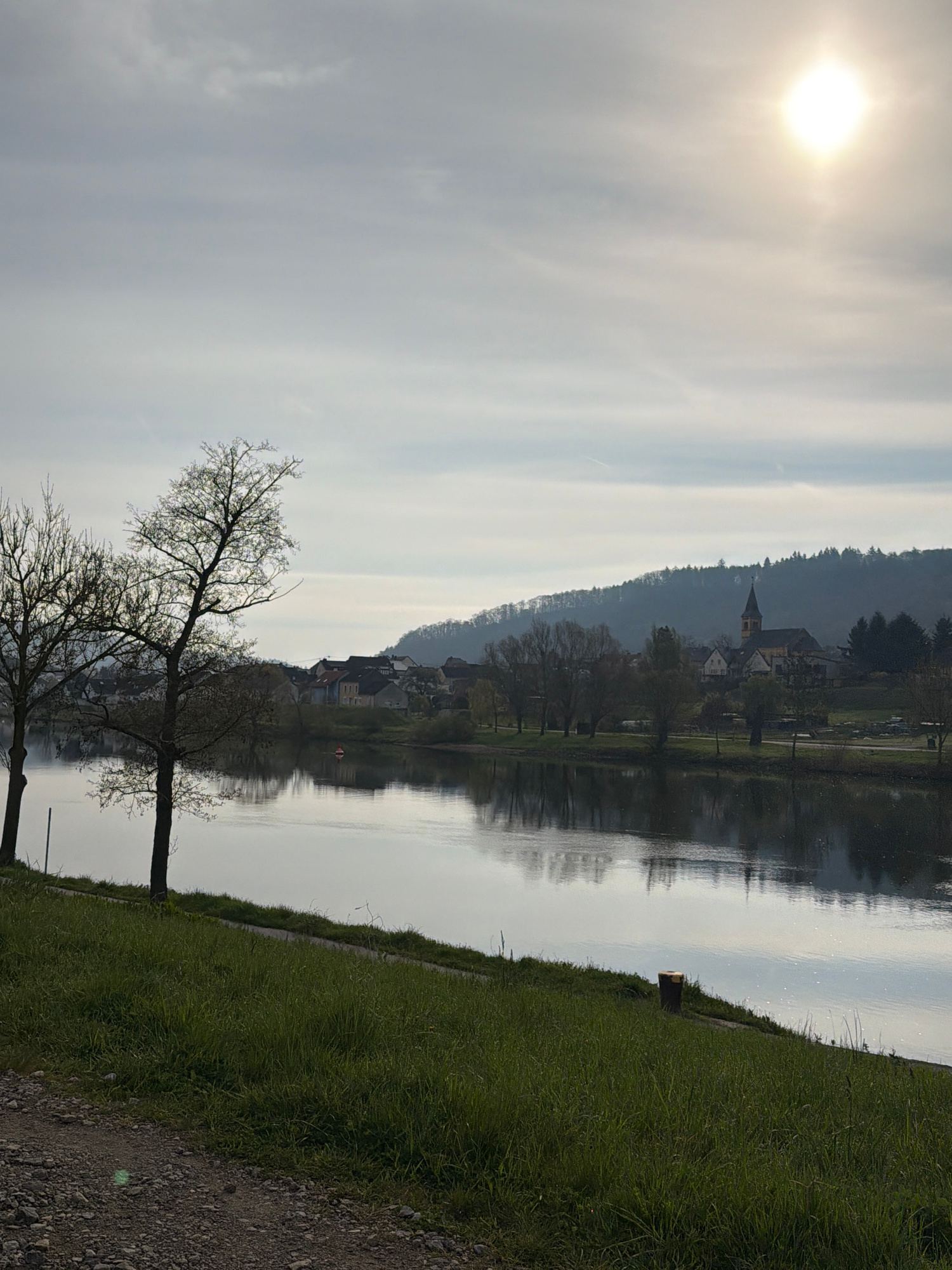 The image depicts a landscape in Wasserbillig, Luxembourg, with a body of water reflecting the scene. The sun shines brightly through a cloudy sky. On the right side of the image is a grassy bank tran…read more
