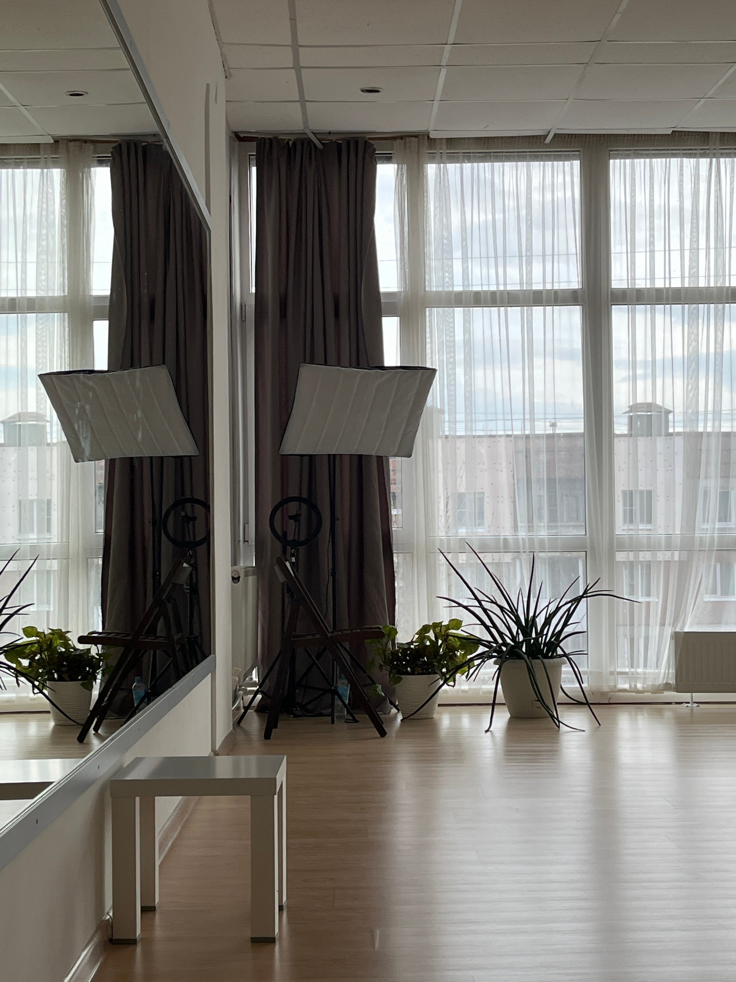 The image displays an indoor room, characterized by a brightly lit atmosphere. A large section of the right wall is dominated by tall windows, which are covered by sheer white blinds, diffusing natura…read more