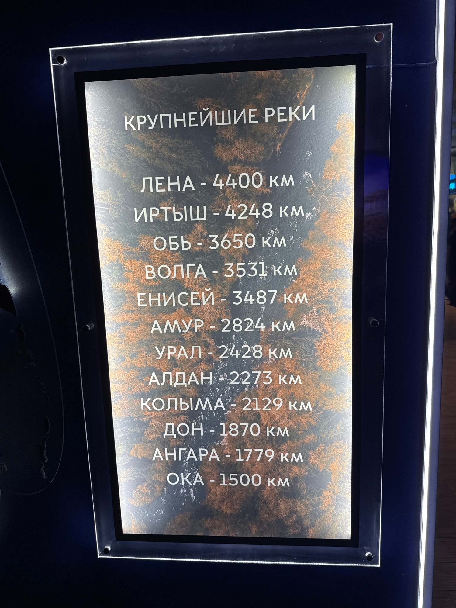 The image shows a sign in Russian, displaying a list of major rivers and their lengths in kilometers. The sign reads: "КРУПНЕЙШИЕ РЕКИ" (Major Rivers), followed by a list including Lena (4400 km), Irt…read more