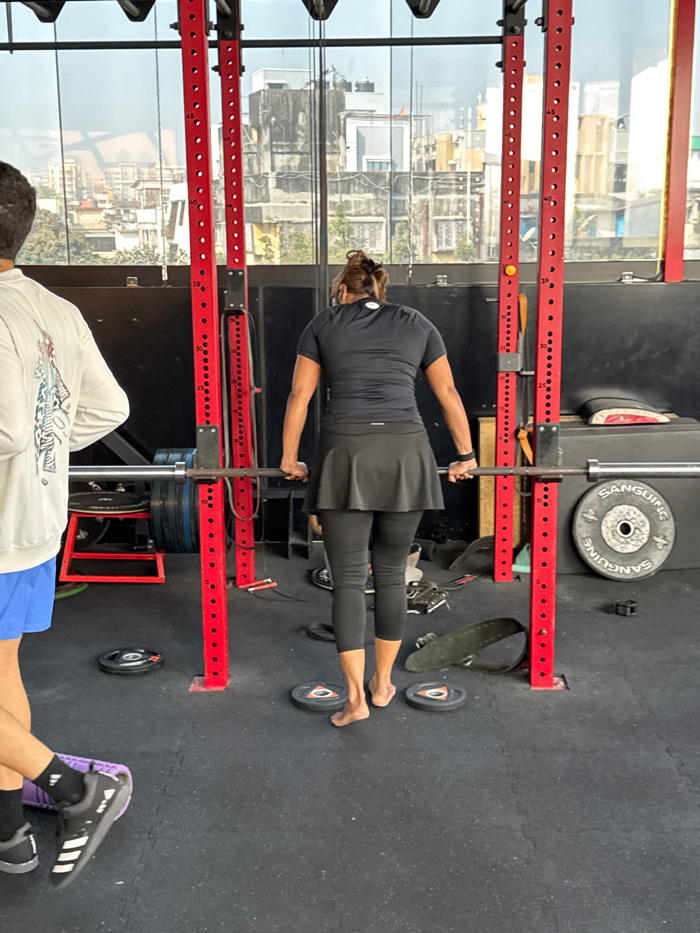 In a gym setting, a woman wearing black athletic attire is performing a gymnastic ring exercise. The rings are supported by a red squat rack, and weight plates are visible around the rack. A man's leg…read more