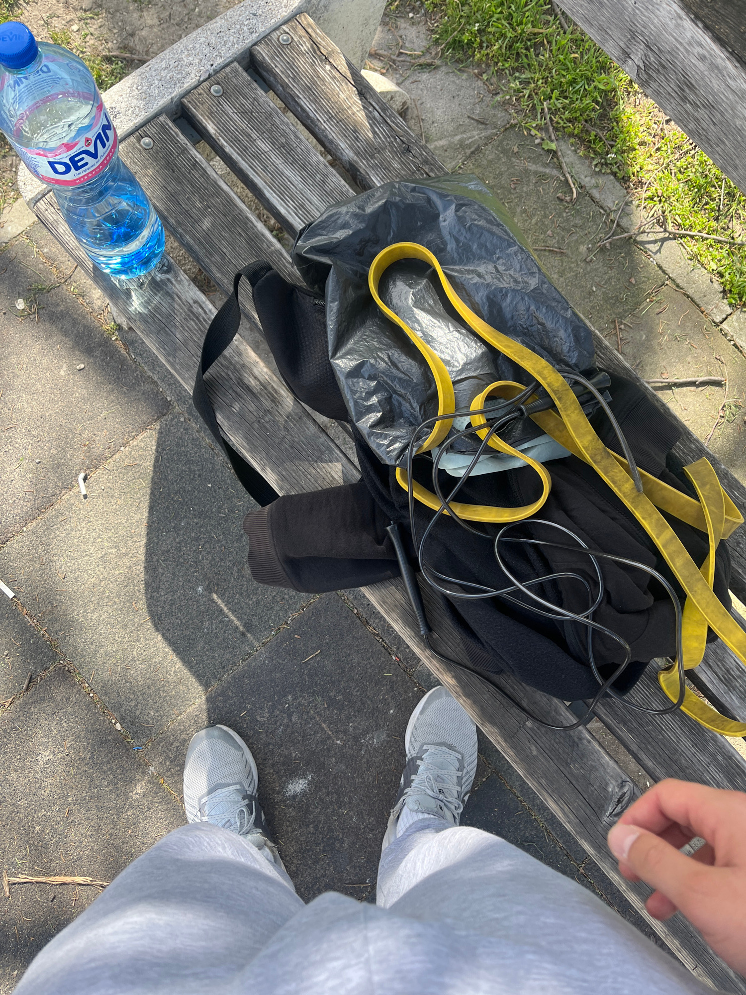 The image captures an overhead view of an outdoor scene, likely a public park or green space in Shumen, Bulgaria. A weathered wooden slatted bench with concrete supports occupies the mid-ground. On t…read more