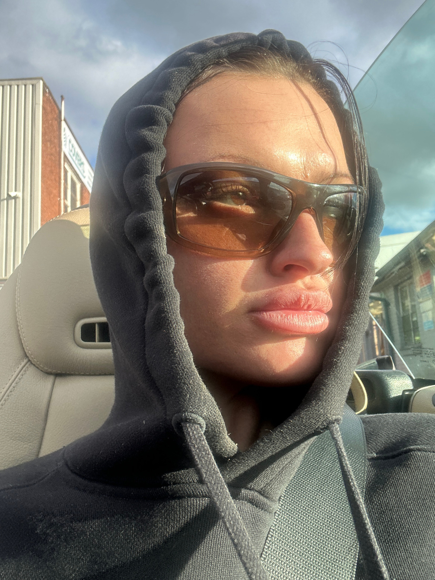 The image displays a female individual situated within a vehicle on Longfield Road, Tunbridge Wells, United Kingdom. The subject, visible from the chest upwards, wears a dark-colored hooded sweatshirt…read more