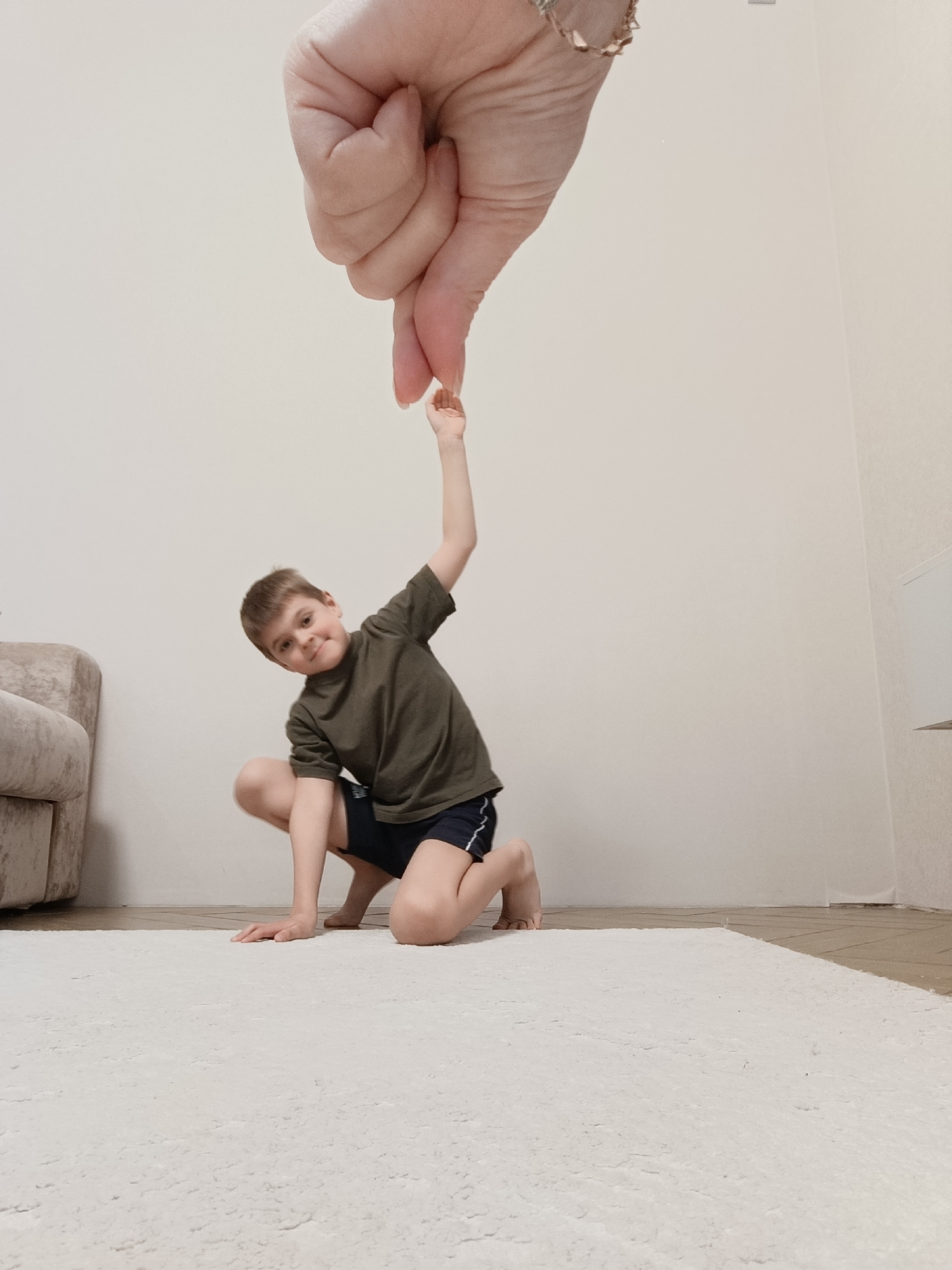 A young boy with short brown hair is kneeling on a white rug in a room with light beige walls. He is wearing a dark green T-shirt and dark blue shorts with white stripes. His left arm is raised, and h…read more