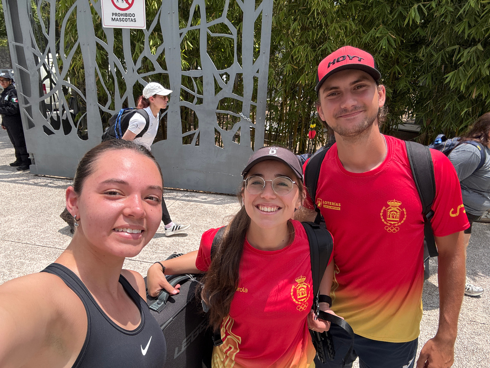 Three individuals are posing for a selfie in front of a gate with a tree-like design. The person on the left wears a red and yellow t-shirt, a red cap with "HOYT" on it, and has a backpack. The person…read more