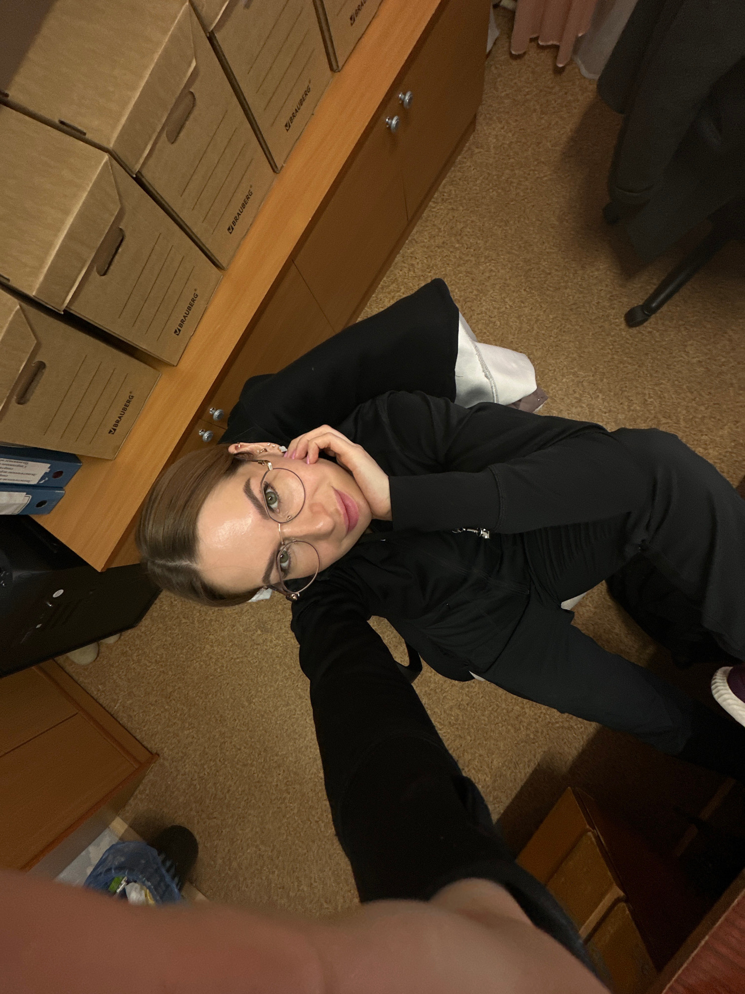 A young woman with glasses is lying on a floor near a desk. The location is likely in Chaikovsky, Russia, given the Brauberg branded boxes. The woman is wearing a black tracksuit. Next to the desk, thβ¦read more