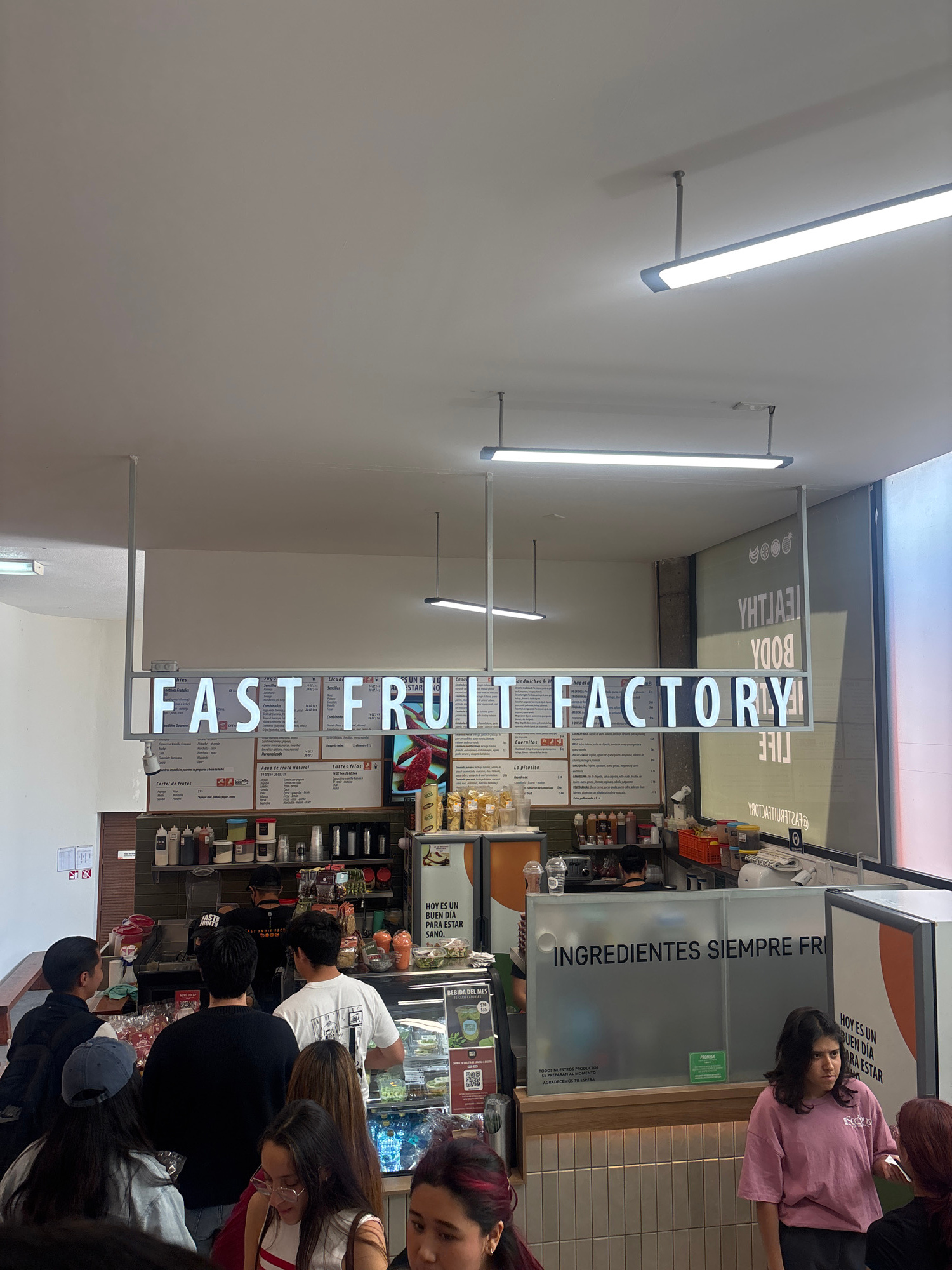 The image captures the interior of a Fast Fruit Factory store, likely in San Andrés Cholula, Mexico. The establishment is busy, with several customers queued at the counter. Menu boards display a vari…read more
