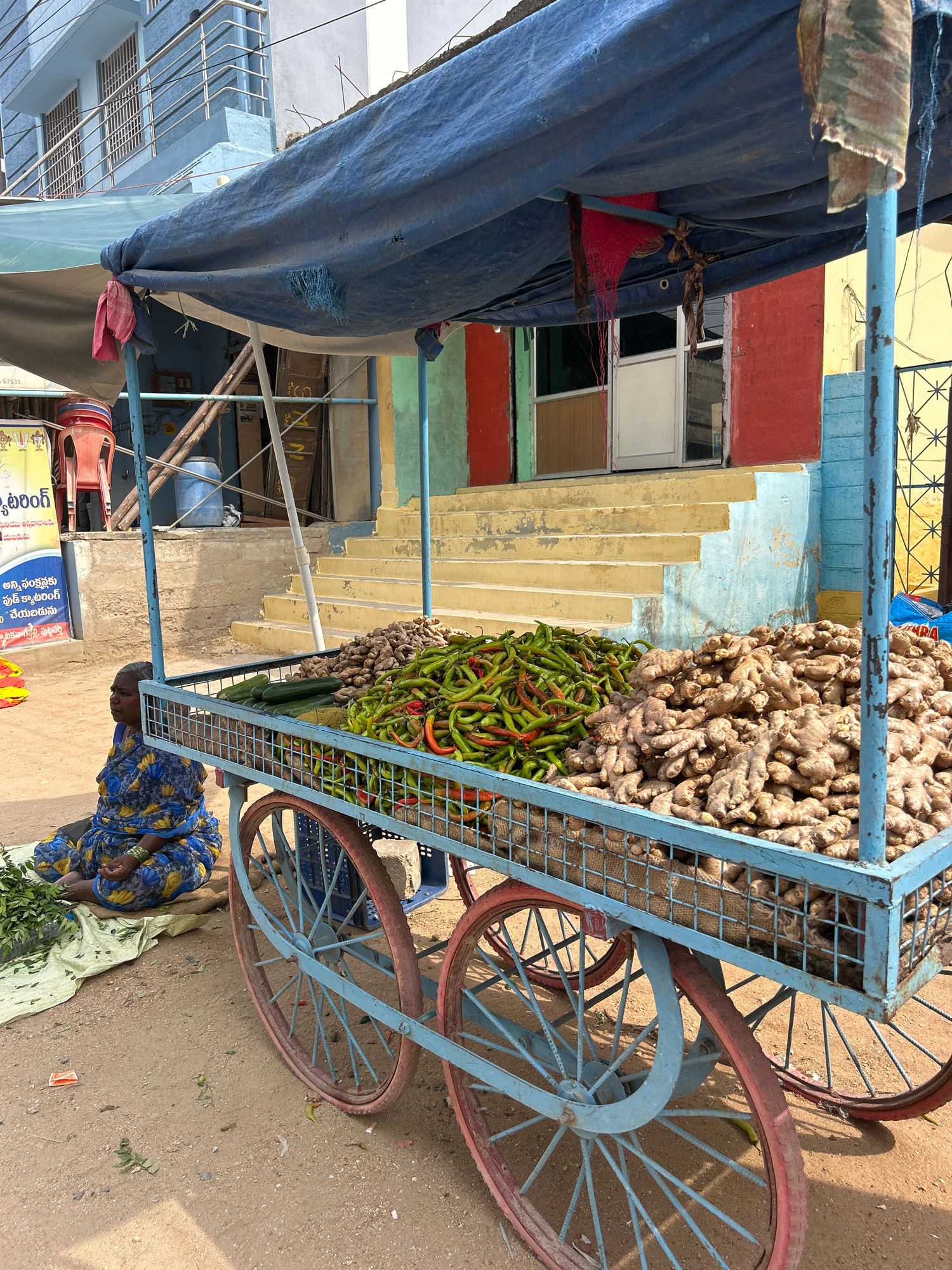 The image depicts a street scene in Puttaparthi, India. A blue metal pushcart, filled with a large quantity of ginger and green chilies, is the central object. The cart has red-rimmed wheels with ligh…read more