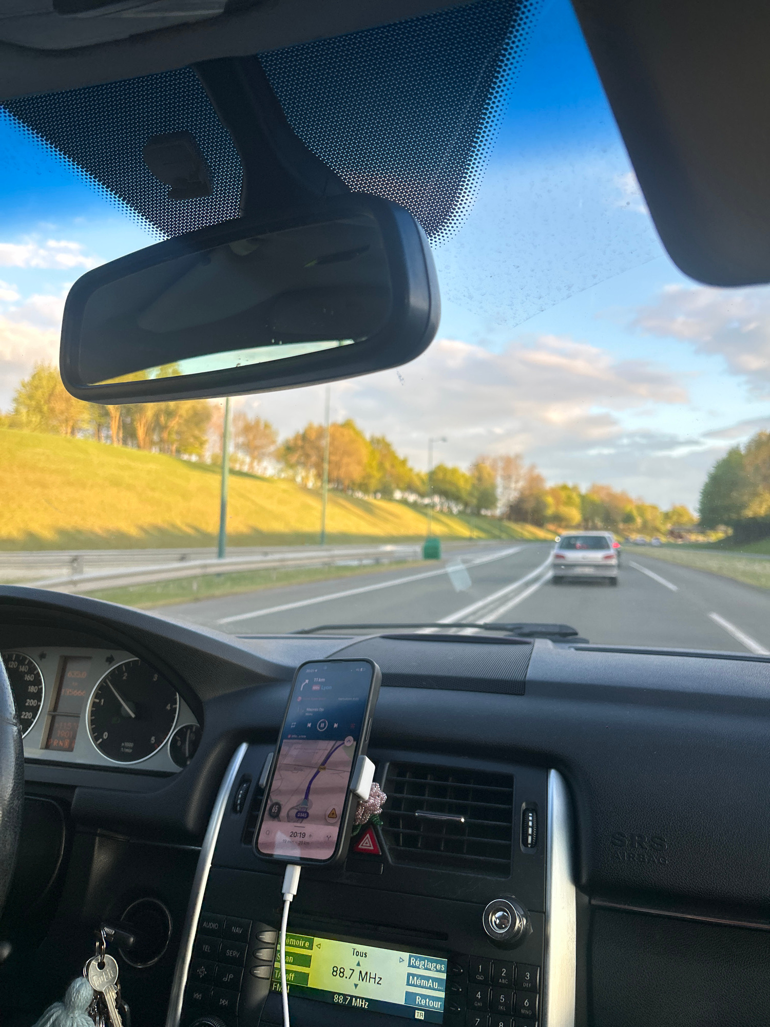 The image shows the interior of a car, likely a Mercedes, with the driver's perspective facing the road. The car is in motion on a multi-lane highway in what appears to be a rural area. Through the wi…read more