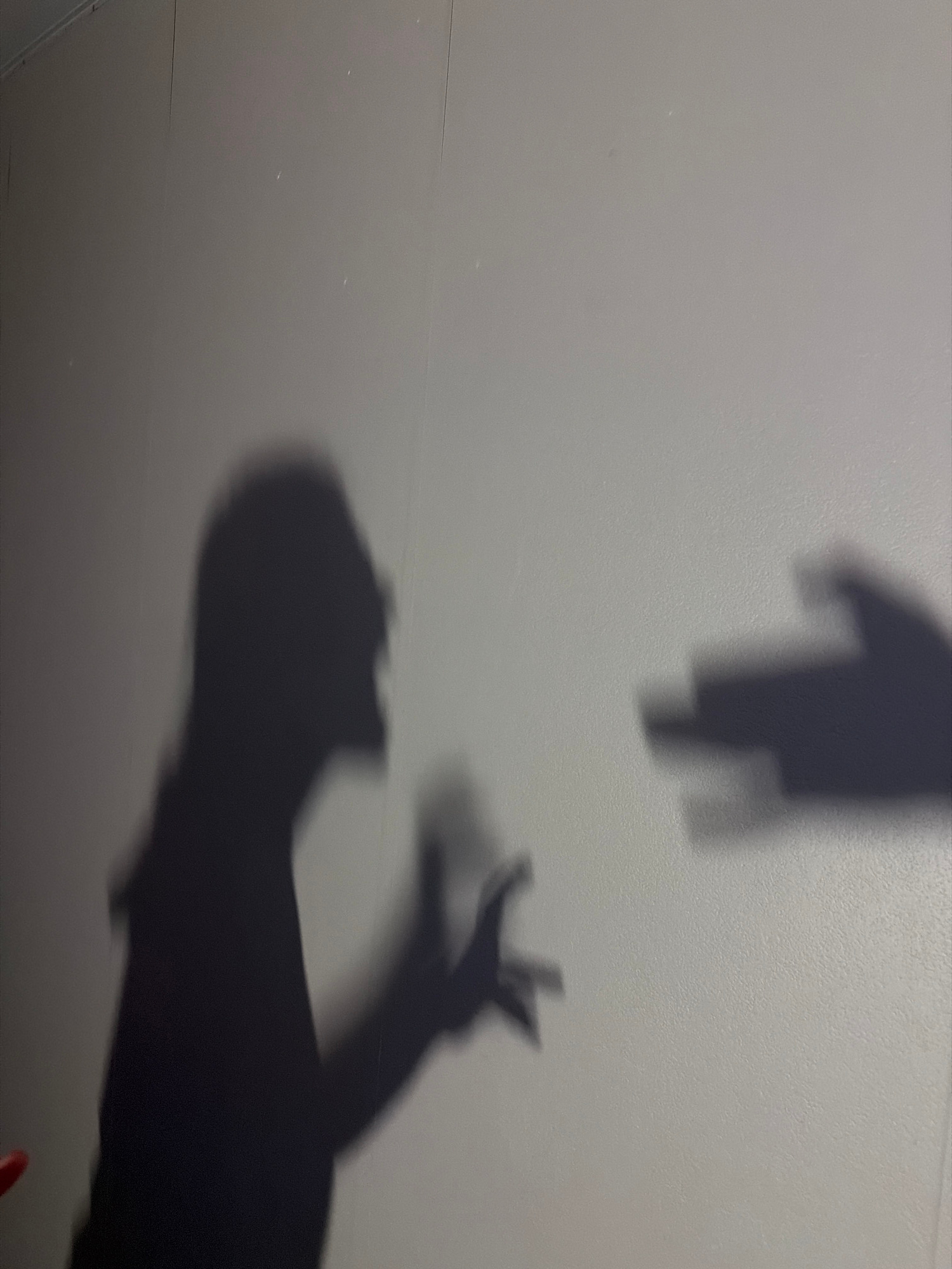 The image shows shadows on a light gray surface, likely a wall or ceiling. There are two distinct shadows: one resembling a person's head, neck, and arm with an outstretched hand, and another smaller…read more