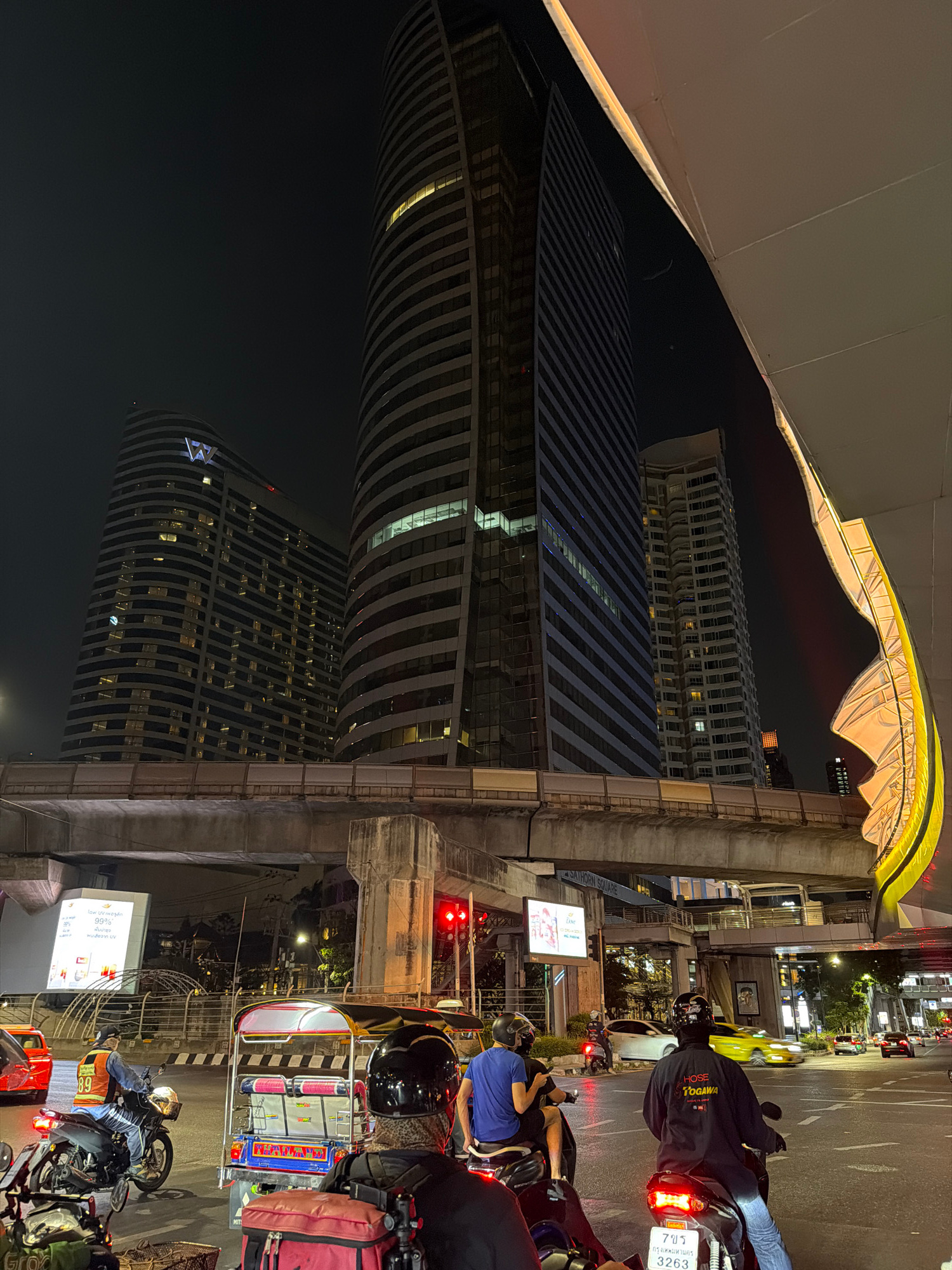 The image captures a nighttime street scene in Bangkok, Thailand. A tall, modern building with a unique curved design dominates the left side of the frame. The architecture suggests a contemporary hot…read more