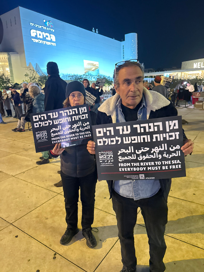 A group of protestors hold signs that read in Hebrew, Arabic, and English, "From the river to the sea, everybody must be free." The signs also include a QR code. The protestors appear to be standing o…read more