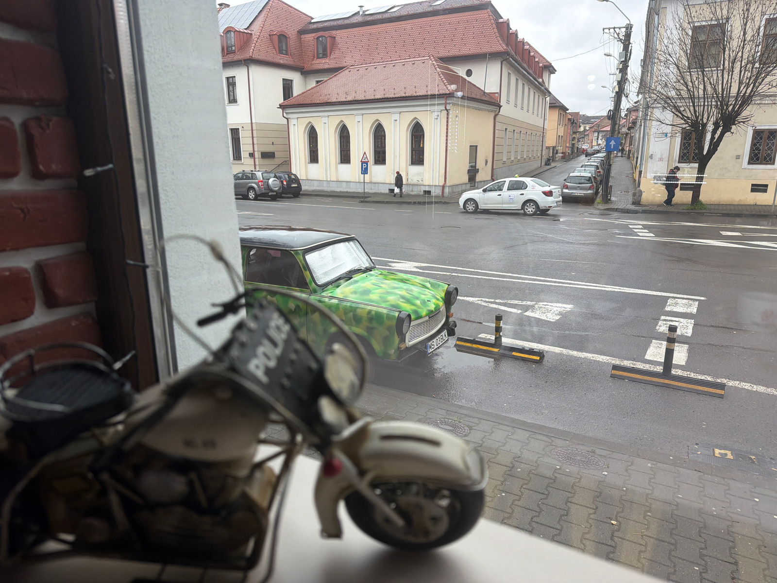 A view from indoors, possibly a shop window, reveals a street scene in Târgu Mureș, Romania. In the foreground, a blurred motorcycle model with "POLICE" visible on a fairing-like element is situated o…read more