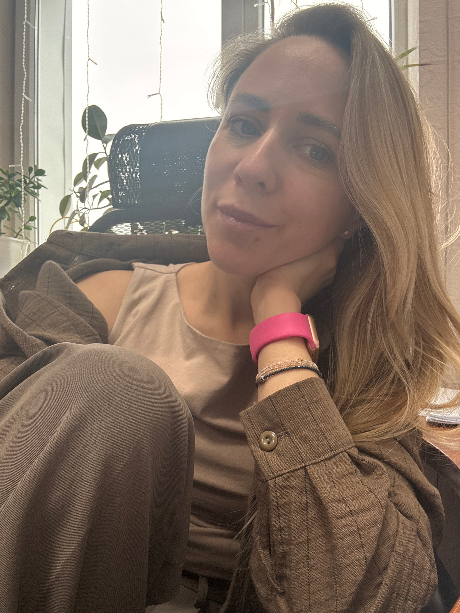 A woman with long blonde hair is posing for a selfie. She is wearing a brown button-down shirt over a beige tank top. She is also wearing brown pants. On her wrist, she has a pink watch and a bracelet…read more