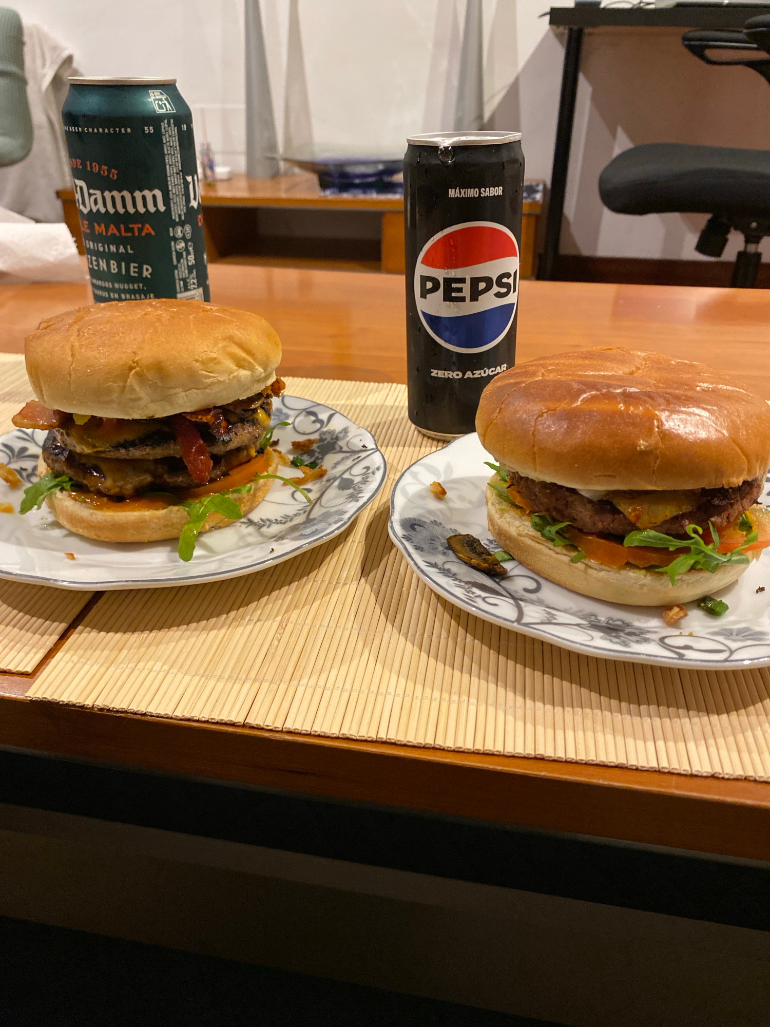 The image shows a table setting with two burgers on plates, a can of Pepsi Zero, and a can of Damm Malia beer. The burgers appear to have patties, vegetables, and sauce. The setting is on a table with…read more