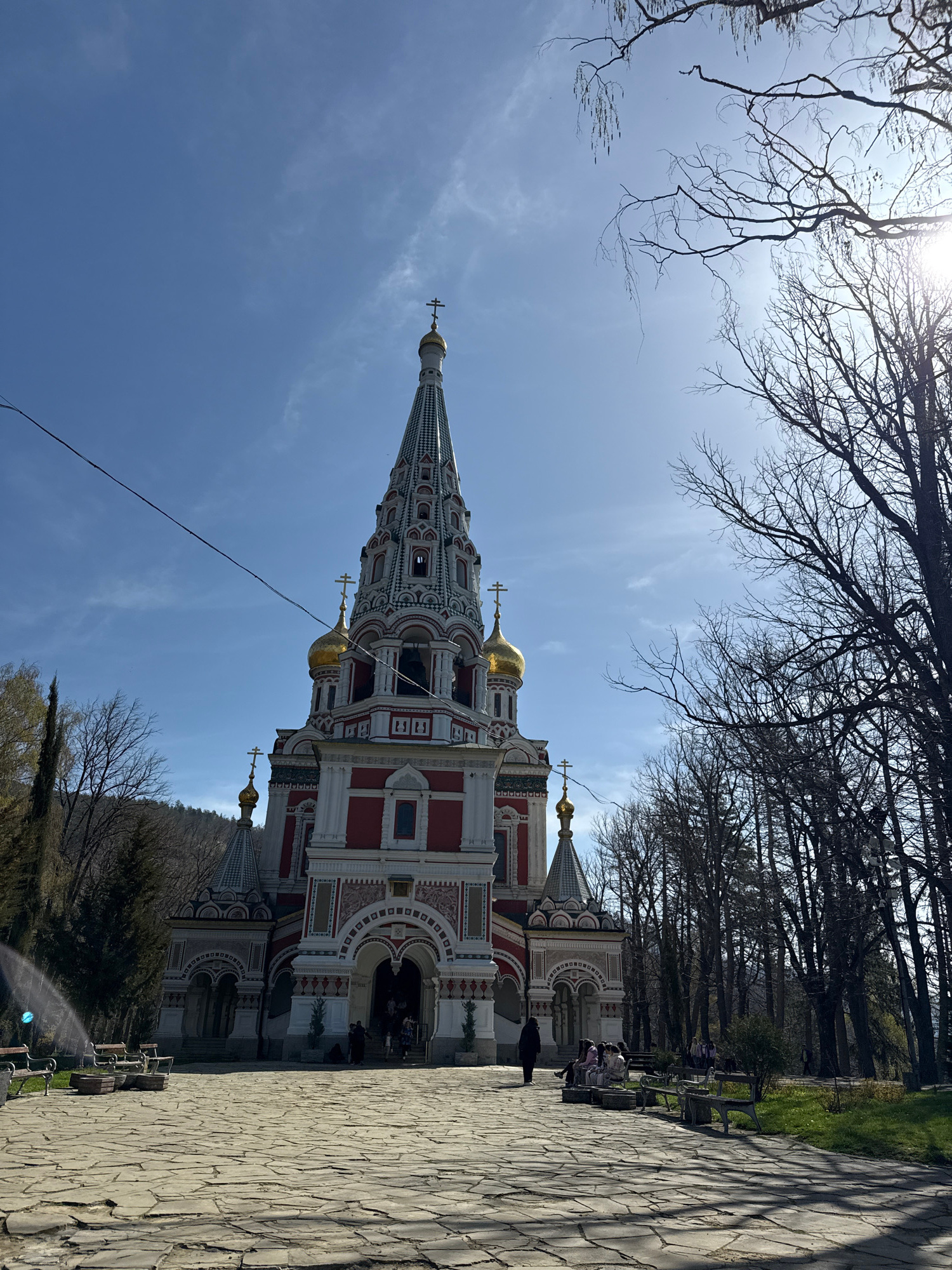 This image captures the majestic Shipka Memorial Church (also known as the Nativity of Christ Church) in Shipka, Bulgaria, under a clear, bright blue sky. The church is a stunning example of Russian R…read more