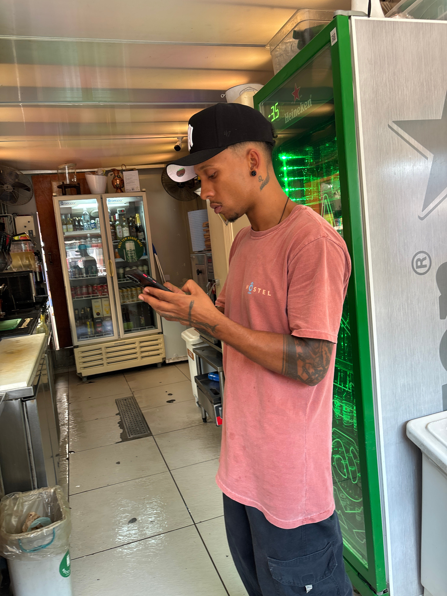 A man stands in what appears to be a commercial establishment, possibly a store or small business, in São Paulo, Brazil. He is wearing a pink t-shirt, dark-colored pants, and a black baseball cap, loo…read more