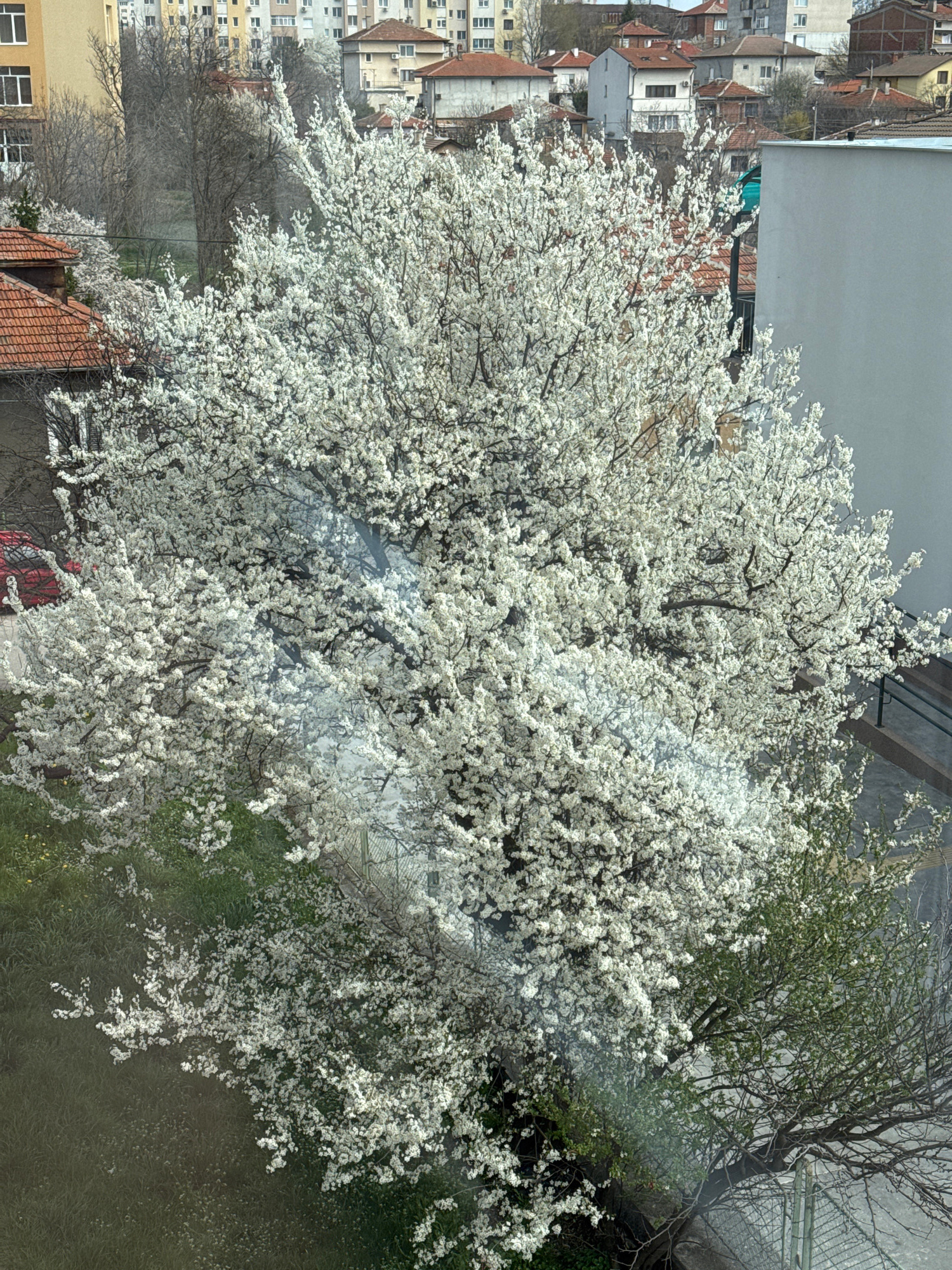 This image, likely taken from a high vantage point in Haskovo, Bulgaria, shows a large blossoming tree dominating the foreground. The tree's white flowers are densely packed, obscuring much of its bra…read more