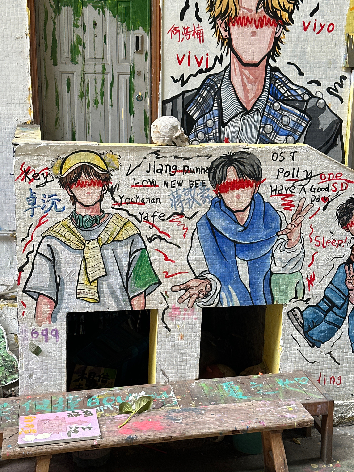 The image shows a section of a wall covered in graffiti art, likely an exterior wall of a building in the Jiulongpo District, China. The wall is constructed of small white tiles and features several c…read more