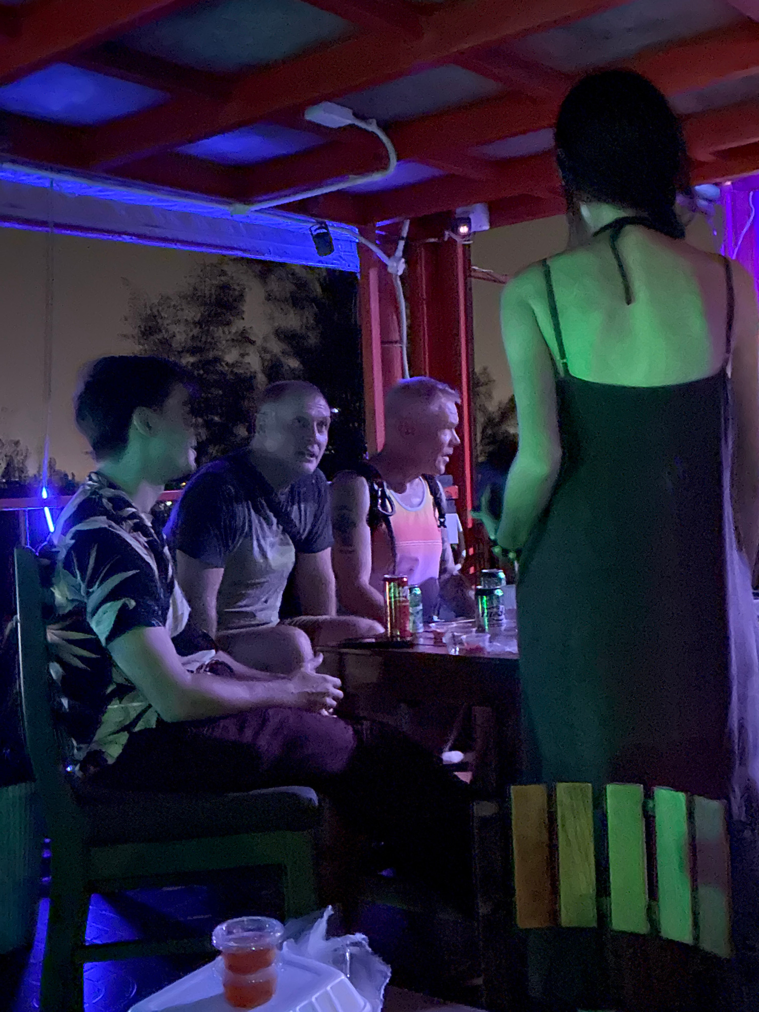 Three individuals are seated at a table in what appears to be an outdoor venue in Đà Nẵng, Vietnam. From the viewers perspective, a person with dark hair and a floral pattern shirt is closest, sitting…read more