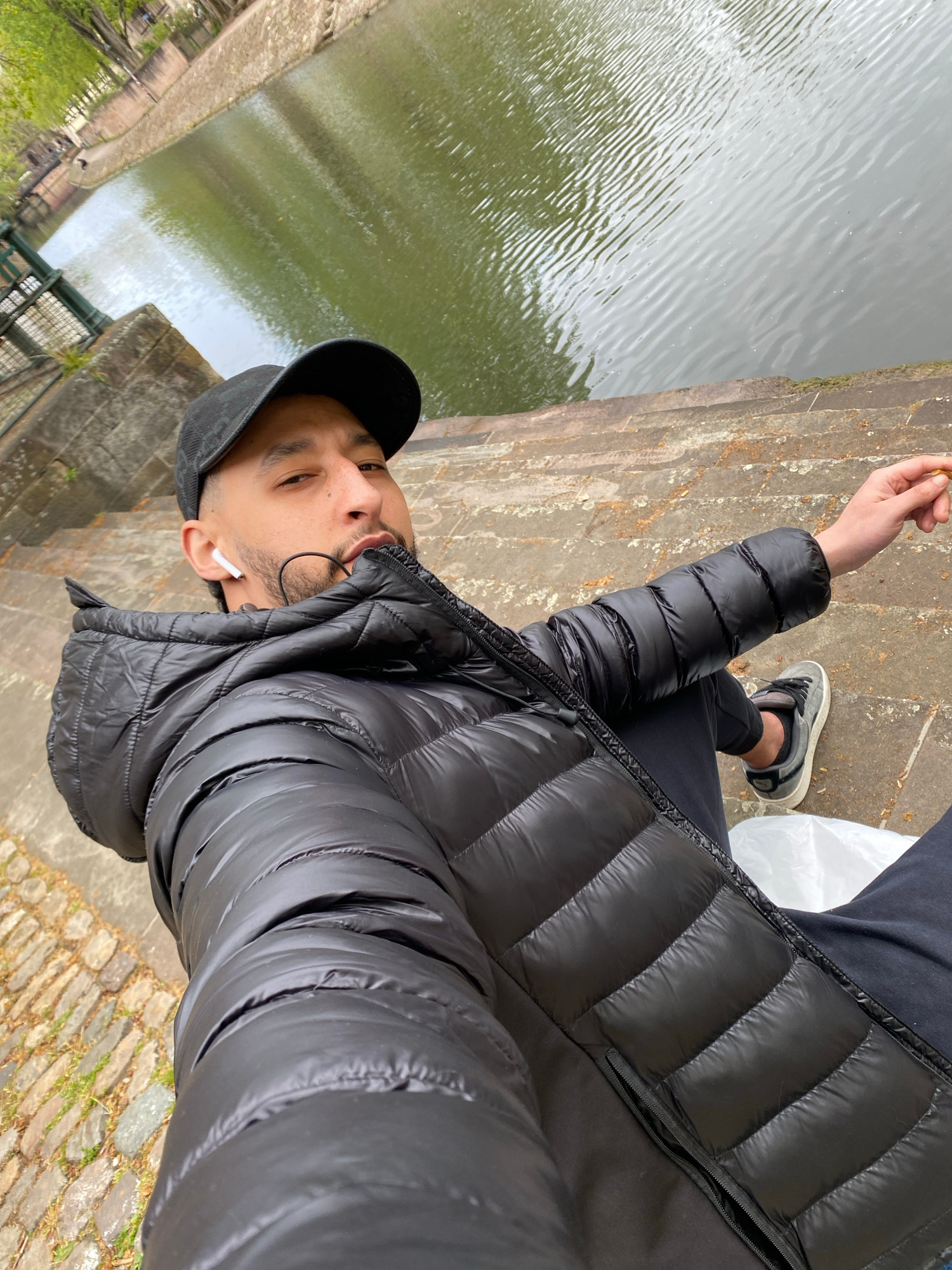 A man stands by a canal in Strasbourg, France, holding an object in his right hand. He wears a black puffer jacket, black cap, and grey sneakers. In his ear, he has an earbud. The canal has green wate…read more