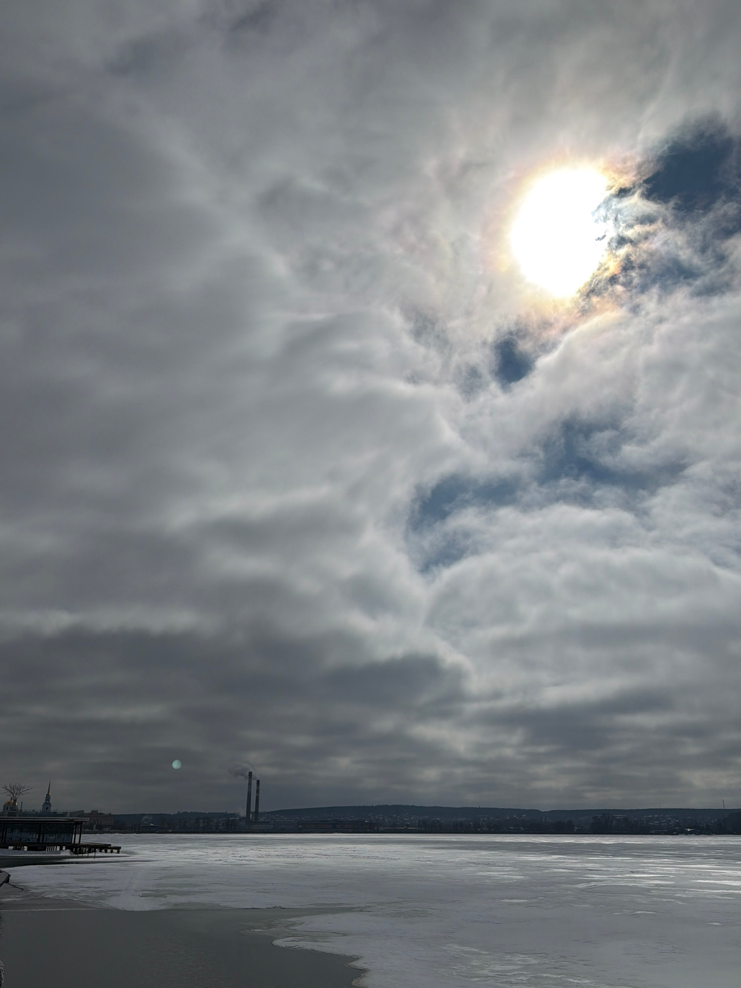The image shows a partially frozen lake in Votkinsk, Russia under a cloudy sky with the sun visible through the clouds. A city skyline is visible on the opposite shore of the lake, featuring industria…read more