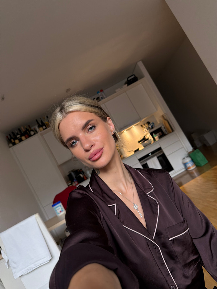 A blonde female with blue eyes and pink lips is depicted in a close-up selfie-style photograph, holding the camera at arm's length. She wears a dark brown satin or silk long-sleeved top with white pip…read more