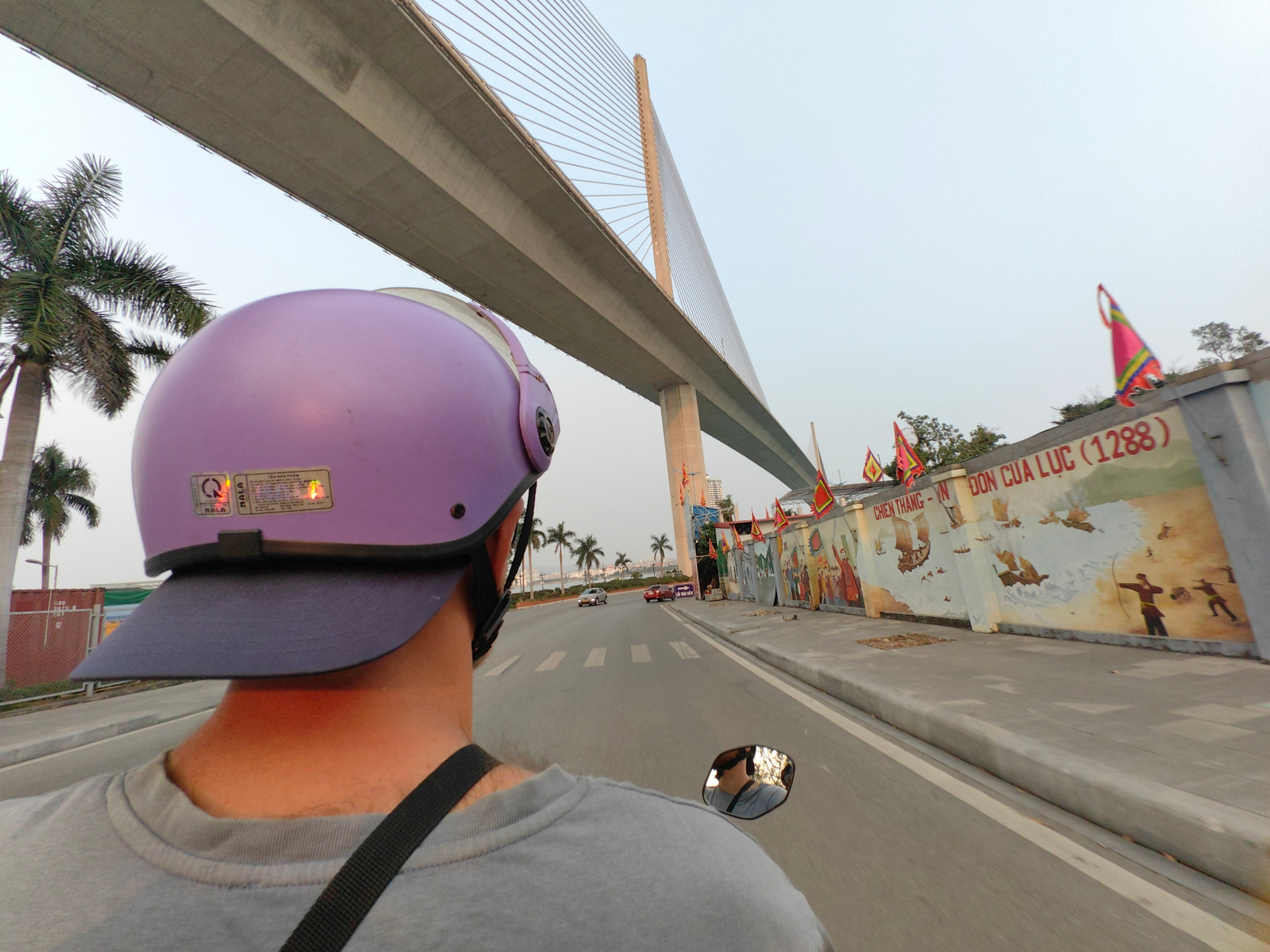 The image shows a person riding a motorbike on a road in Bai Chay Ward, Vietnam. The rider is wearing a purple helmet with a blue brim and a gray shirt. A suspension bridge is above the rider and a pa…read more