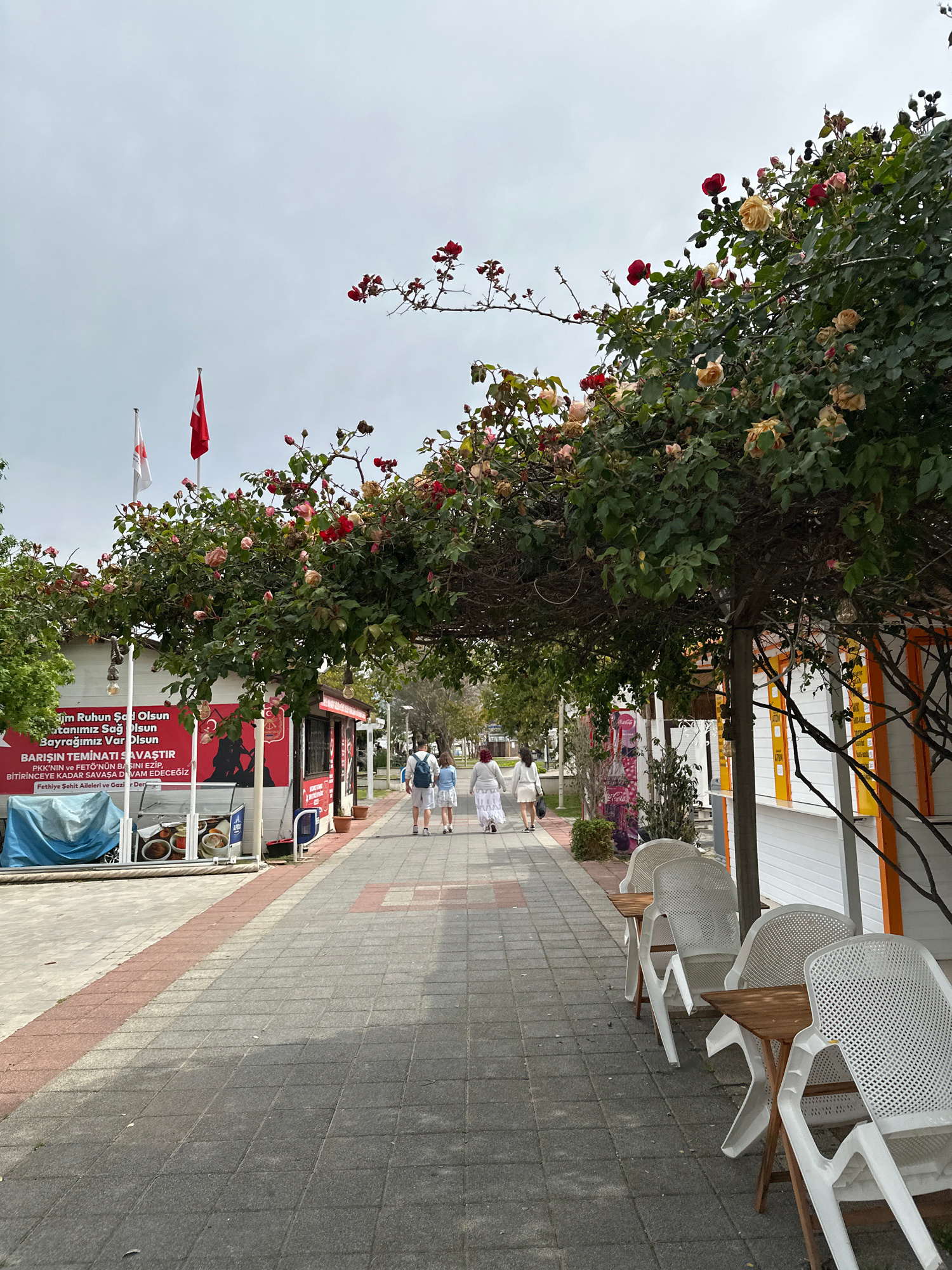 The image shows a sidewalk in Fethiye, Turkey, lined with flowering bushes. Several Turkish flags are on display. People are walking in the distance on the sidewalk. The sidewalk is paved with grey an…read more