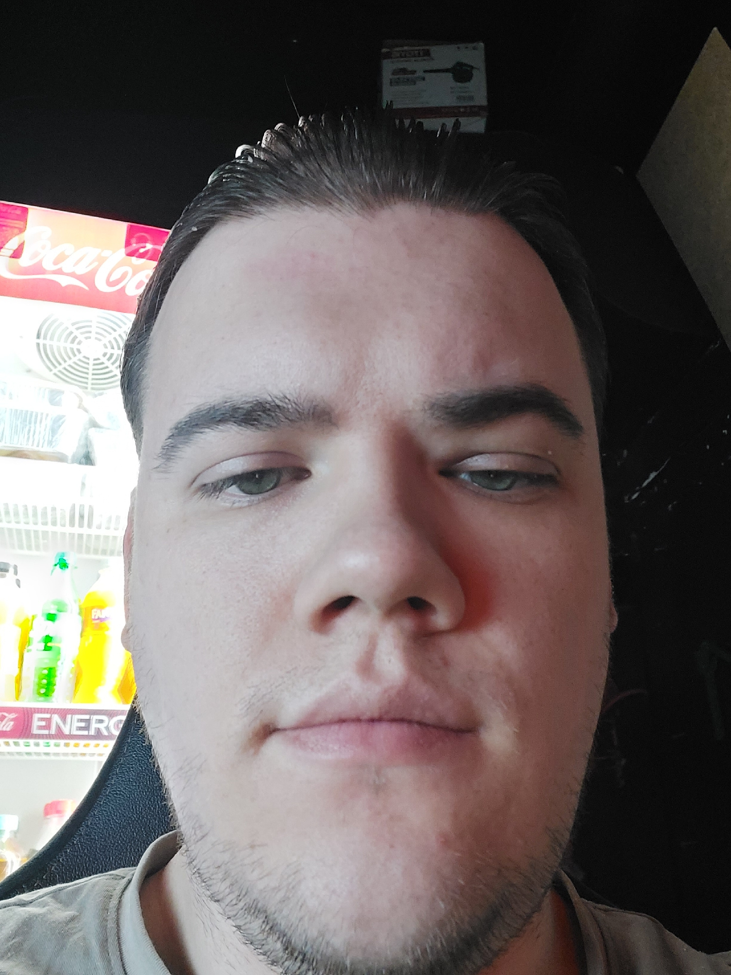 A close-up photo of a man's face, slightly angled. The man has fair skin, dark eyebrows, and green eyes. He has short, dark hair that appears to be slicked back. He also has stubble. He is positioned…read more